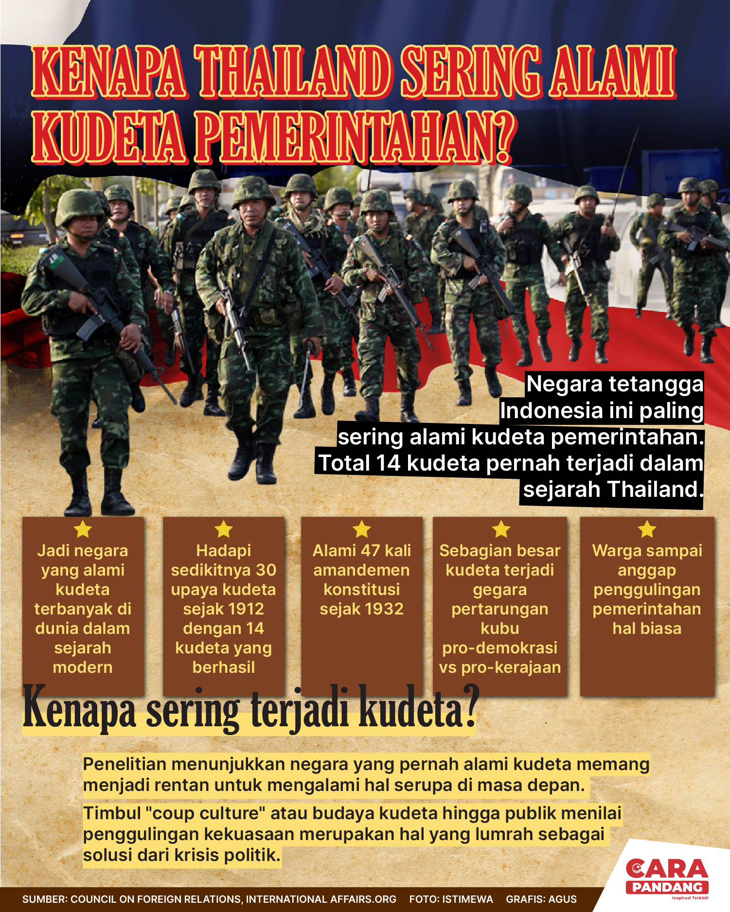 Beranda Infografis Kenapa Thailand Sering Alami Kudeta Pemerintahan? Infografis Kenapa Thailand Sering Alami Kudeta Pemerintahan? Kenapa Thailand sering alami kudeta pemerintahan? Penulis Edo Soeryadi - 16 Juli 2025 08:36 0 CARAPANDANG.COM - Thailand. Tags Infografik Berita Sebelumnya Sekolah Garuda, Wamendiktisaintek Dorong STEM dan Riset di Perbatasan Berita Berikutnya Indonesia Dalam Dilema Misi Perdamaian Dunia LEAVE A REPLY Cancel reply Comment: Please enter your comment! Name:* Please enter your name here Email:* You have entered an incorrect email address! Please enter your email address here Website: Save my name, email, and website in this browser for the next time I comment. Berita Teratas Kisah Ajaib Nabi Sulaiman dan Anak yang Berbakti kepada Orang Tua 8 Cara Merawat Kucing Kesayangan Agar Tubuhnya Selalu Sehat Minuman yang Mampu Redakan Batuk yang Menganggu Manfaat Ajaib Bawang Putih Bagi Kesehatan 8 Cara Menjaga Kesehatan Gigi dan Mulut yang Efektif Berita Terkait Berita Terkait Wajah Baru PP Tunas: Garda Terdepan Perlindungan Anak Indonesia Zoel Rachman - 31 Maret 2026 09:42 MBG 5 Hari Sepekan Masih Wacana Maliq - 30 Maret 2026 11:49 Presiden Ingin Semua Kendaraan Dikonversi ke Listrik Maliq - 30 Maret 2026 11:48 Kewaijiban PSE Terhadap Pengguna Anak Maliq - 30 Maret 2026 11:15