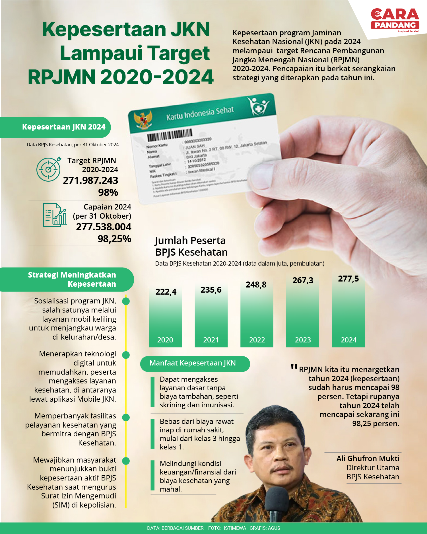 CARAPANDANG.COM - Kepesertaan program Jaminan Kesehatan Nasional (JKN) pada 2024 melampaui target RPJMN 2-20-2024. Pencapaian itu berkat serangkaian strategi yang diterapkan pada tahun ini.