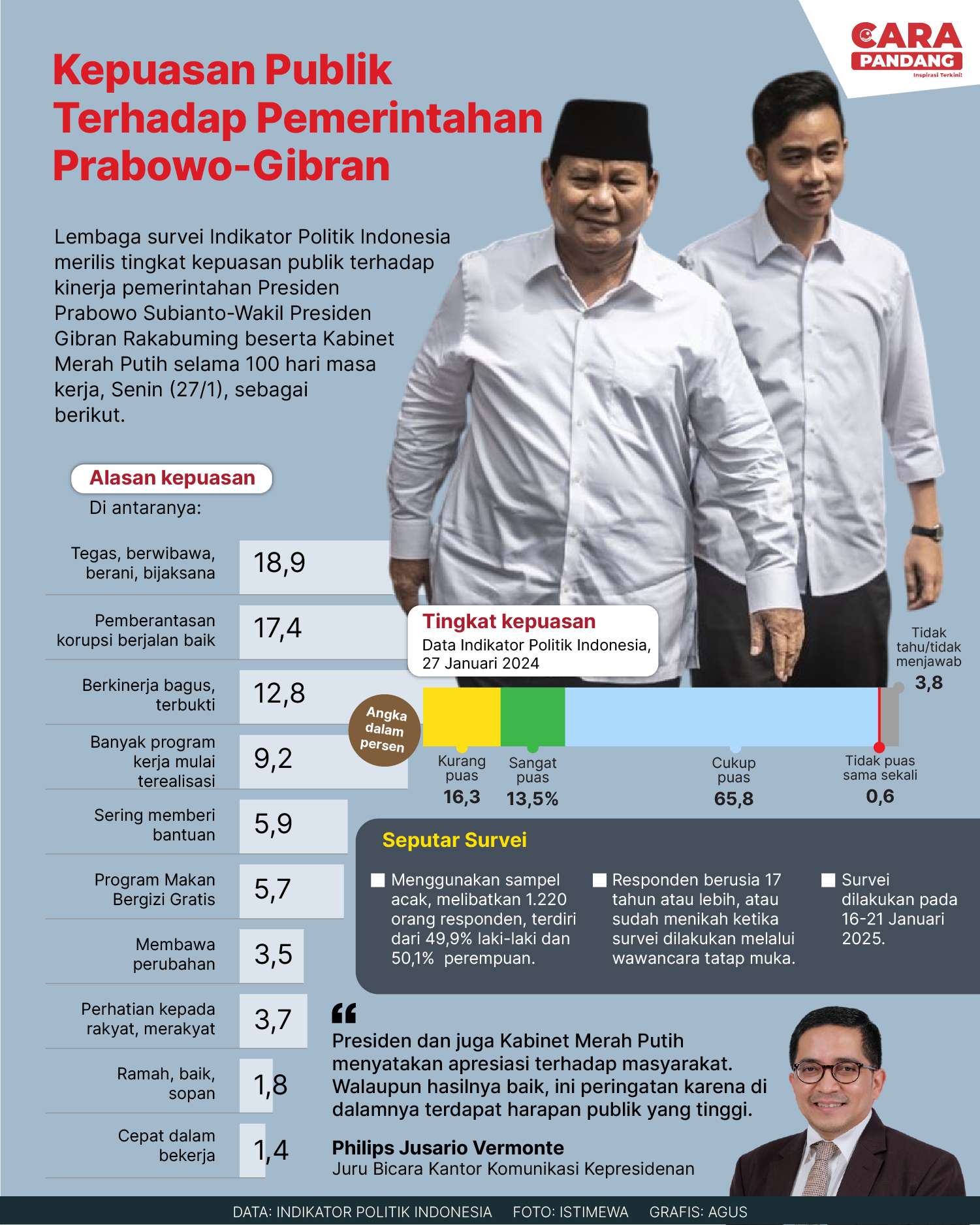 Beranda Infografis Kepuasan Publik Terhadap Pemerintahan Prabowo-Gibran Infografis Kepuasan Publik Terhadap Pemerintahan Prabowo-Gibran Penulis Amira Izzati - 31 Januari 2025 09:20 0 CARAPANDANG - Kepuasan Publik Terhadap Pemerintahan Prabowo-Gibran Tags Berita Sebelumnya Dubes Romania Temui Gubernur Sumbar untuk Membahas Sejumlah Rencana Kerjasama Berita Berikutnya Indonesia Dalam Dilema Misi Perdamaian Dunia LEAVE A REPLY Cancel reply Comment: Please enter your comment! Name:* Please enter your name here Email:* You have entered an incorrect email address! Please enter your email address here Website: Save my name, email, and website in this browser for the next time I comment. Berita Teratas Kisah Ajaib Nabi Sulaiman dan Anak yang Berbakti kepada Orang Tua 8 Cara Merawat Kucing Kesayangan Agar Tubuhnya Selalu Sehat Minuman yang Mampu Redakan Batuk yang Menganggu Manfaat Ajaib Bawang Putih Bagi Kesehatan 8 Cara Menjaga Kesehatan Gigi dan Mulut yang Efektif Berita Terkait Berita Terkait Wajah Baru PP Tunas: Garda Terdepan Perlindungan Anak Indonesia Zoel Rachman - 31 Maret 2026 09:42 MBG 5 Hari Sepekan Masih Wacana Maliq - 30 Maret 2026 11:49 Presiden Ingin Semua Kendaraan Dikonversi ke Listrik Maliq - 30 Maret 2026 11:48 Kewaijiban PSE Terhadap Pengguna Anak Maliq - 30 Maret 2026 11:15