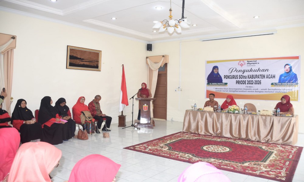 AGAM, CARAPANDANG.COM - Pengukuhan dilakukan dalam sebuah acara pelantikan yang dilakukan oleh Ny Harneli Mahyeldi selaku Ketua Umum Special Olympics Indonesia (SOIna) Provinsi Sumatera Barat, yang sengaja datang dan mengunjungi Kabupaten Agam untuk melakukan pelantikan pengurus SOIna Kabupaten Agam sekaligus melakukan penandatanganan berita acara serta menyerahkan bendera pataka SOIna kepada Ny Yeni Andri sebagai Ketua Umum SOIna Kabupaten Agam Periode 2022-2026 di Mess Pemkab Agam Belakang Balok, Bukittinggi, Jumat (22/9).