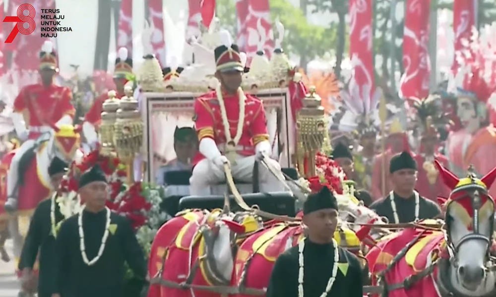 CARAPANDANG - Kemeriahan peringatan Hari Ulang Tahun (HUT) ke-77 Kemerdekaan Republik Indonesia (RI) diawali dengan prosesi kirab budaya dari Monumen Nasional (Monas) menuju Istana Merdeka, Jakarta Pusat, Rabu (17/08/2022). Prosesi kirab budaya ini kembali dilakukan setelah terakhir dilakukan pada tahun 2019, sebelum pandemi Covid-19.