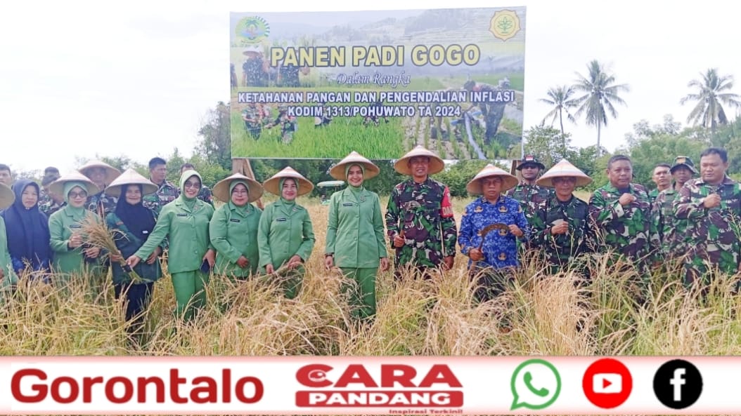 POHUWATO, CARAPANDANG - Kodim 1313/Pohuwato melaksanakan kegiatan panen padi gogo sebagai upaya mendukung ketahanan pangan dan pengendalian inflasi di Kabupaten Pohuwato.