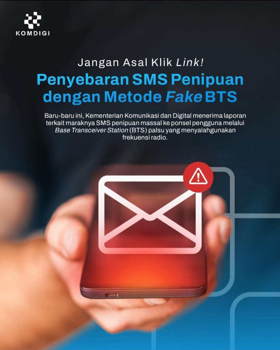 Dilansir dari akun Instagram resmi Kemkomdigi, modus penipuan melalui Fake BTS dilakukan dengan cara pelaku memancarkan sinyal yang menyerupai BTS operator resmi. Dengan menggunakan infrastruktur telekomunikasi ilegal pelaku mengirimkan SMS massal berisi tautan hadiah palsu, permintaan data pribadi, informasi perbankan, hingga kode OTP. Metode ini membuat pesan sulit dilacak dan berada di luar kendali operator resmi.