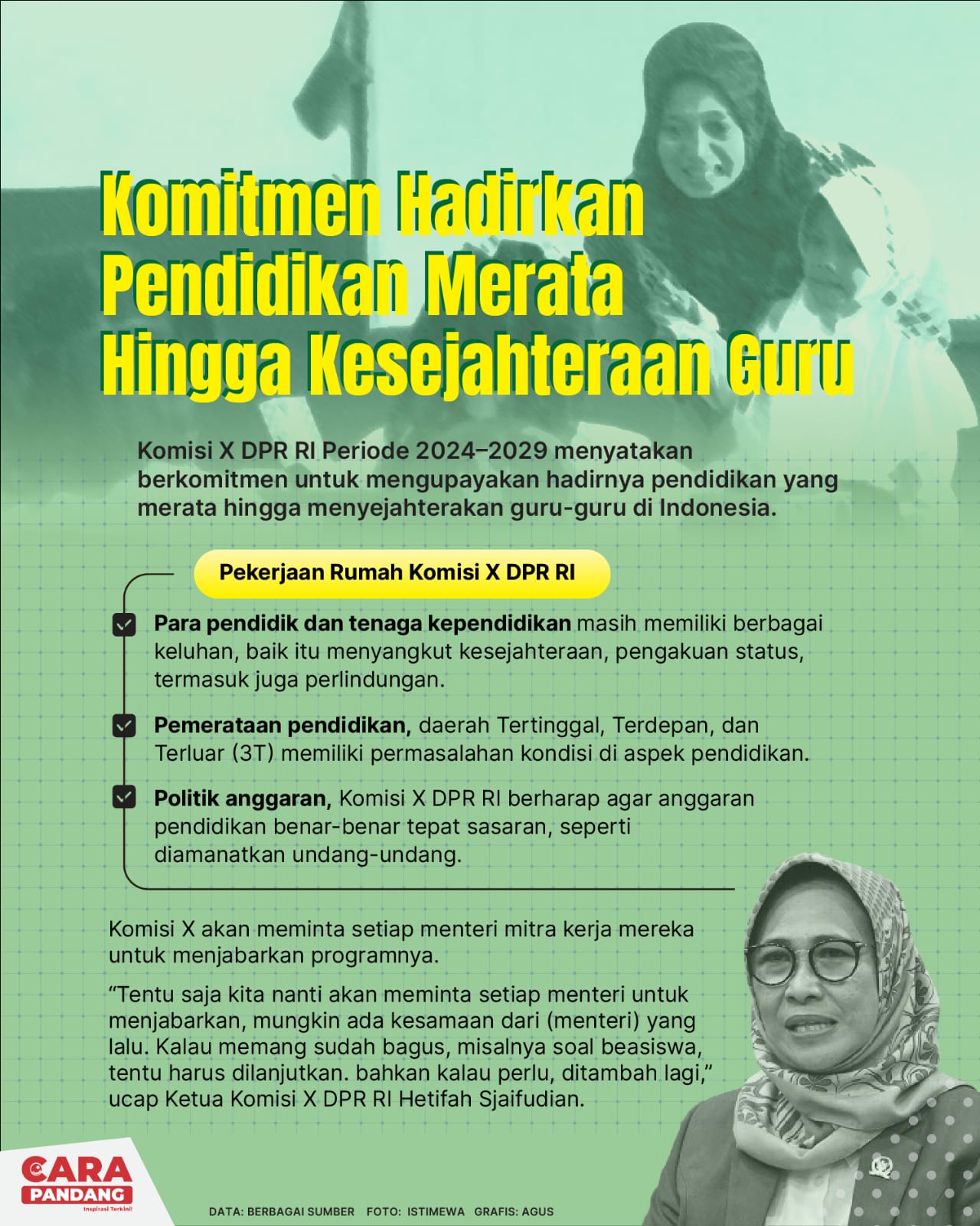 CARAPANDANG - Komisi X DPR RI Periode 2024–2029 menyatakan berkomitmen untuk mengupayakan hadirnya pendidikan yang merata hingga menyejahterakan guru-guru di Indonesia.