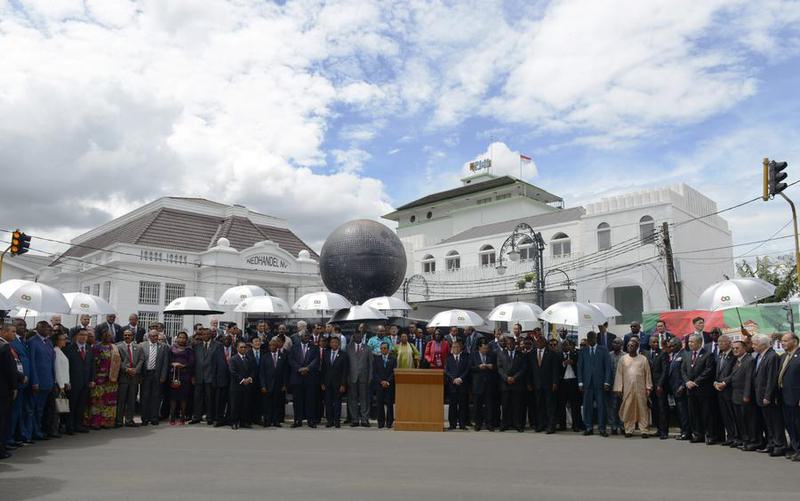 Para pemimpin negara-negara Asia dan Afrika menghadiri upacara penandatanganan Monumen Solidaritas Asia Afrika sebagai bagian dari Peringatan Konferensi Asia Afrika 2015 di Bandung, Provinsi Jawa Barat, pada 24 April 2015. (Xinhua/Liu Yun)