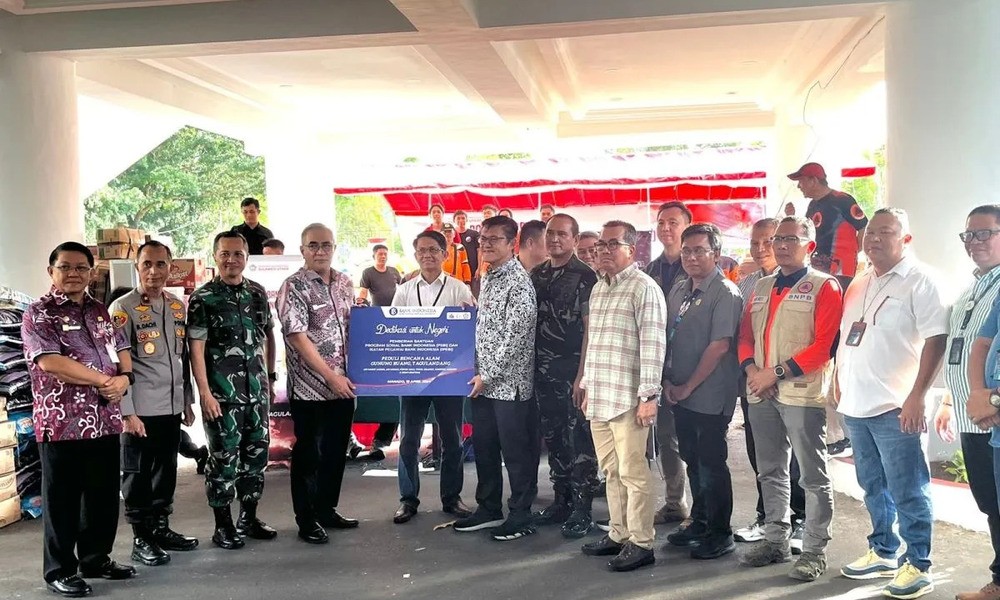 CARAPANDANG - Bank Indonesia (BI) menyerahkan bantuan sosial bencana erupsi Gunung Ruang kepada warga terdampak, di Tagulandang, Kabupaten Kapulauan Sitaro, Sulawesi Utara (Sulut).
