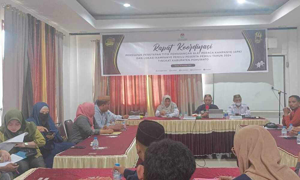 POHUWATO, CARAPANDANG.COM - Komisi Pemilihan Umum Kabupaten Pohuwato gelar Rapat koordinasi persiapan penetapan titik pemasangan Alat Peraga Kampanye (APK) dan Lokasi Kampanye dalam Pemilihan Umum Tahun 2024, Kamis (16/11/2023), di Meeting Room Irene Hotel Marisa.
