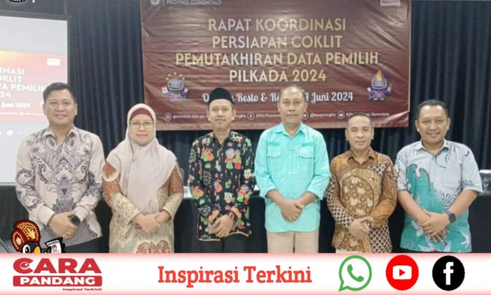 POHUWATO, CARAPANDANG - Ketua KPU Pohuwato Firman Ikhwan bersama Anggota KPU Dian Fadjriyanti Pakaya, Iskandar Ibrahim, Iwan Dolongseda, Usman Dunda, Kasubbag Perencanaan, Data dan Informasi Romy Hilimi dan Operator Sidalih Fadly Mohamad mengikuti Rapat Koordinasi Persiapan Pencocokan dan Penelitian (Coklit) untuk Pemutakhiran Data Pemilih Gubernur dan Wakil Gubernur, Bupati dan Wakil Bupati, serta Walikota dan Wakil Walikota Tahun 2024 di Oceana Resto & Resort Kota Gorontalo, (14/6/2024).