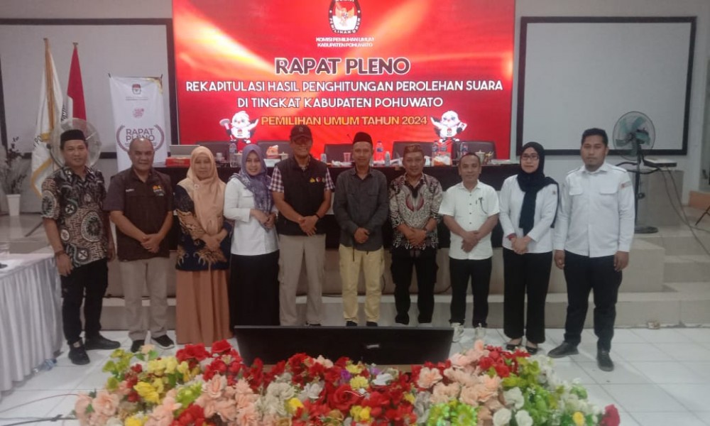 POHUWATO, CARAPANDANG.COM - Komisi Pemilihan Umum (KPU) Kabupaten Pohuwato telah menetapkan perolehan suara untuk lima jenis pemilihan dalam rapat pleno rekapitulasi penghitungan suara hasil Pemilu serentak tingkat kabupaten, Kamis (29/02/2024) dini hari.
