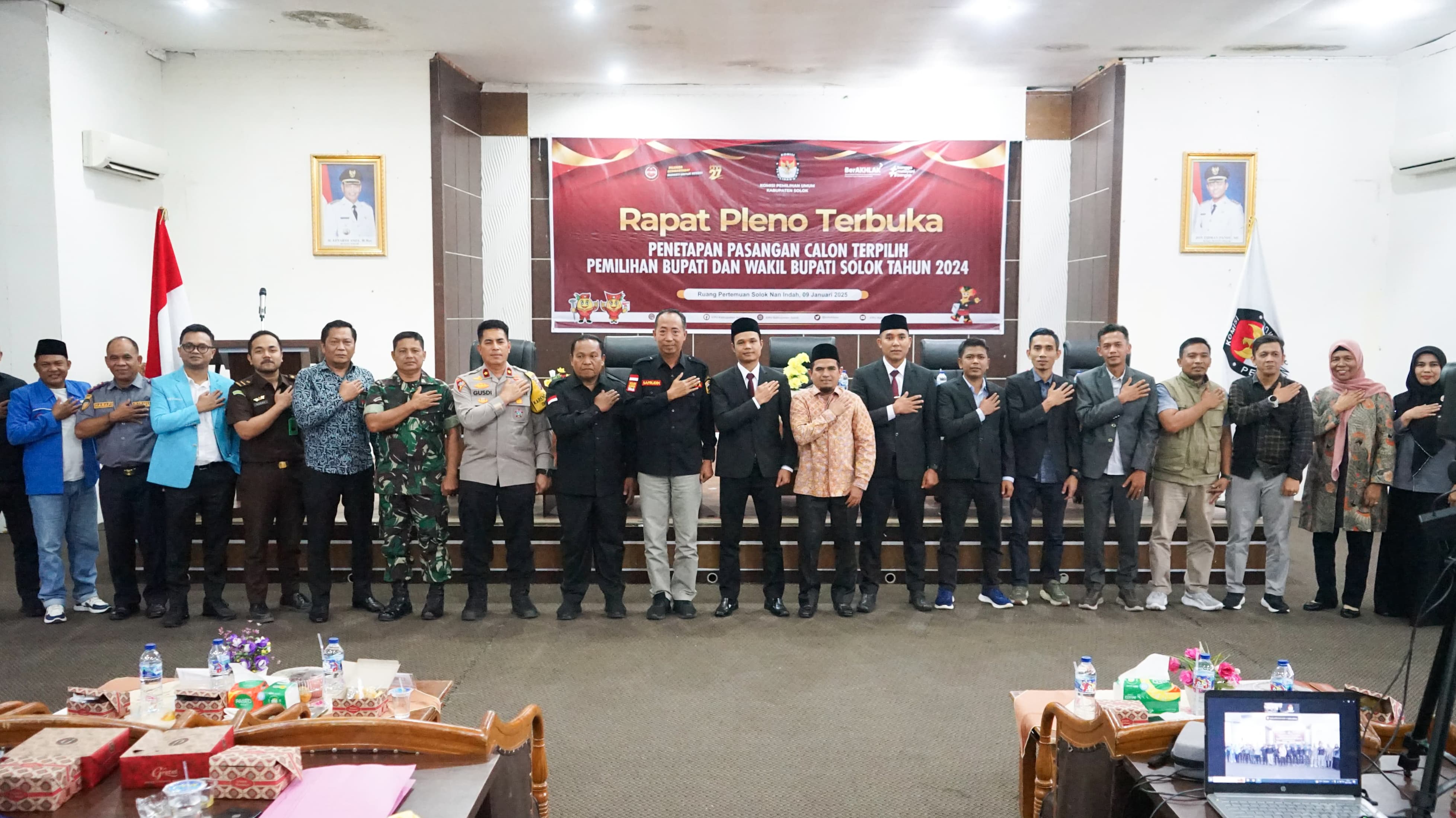 SOLOK, CARAPANDANG - Komisi Pemilihan Umum (KPU) Kabupaten Solok menggelar Rapat Pleno Terbuka Penetapan Pasangan Calon Terpilih Pemilihan Bupati dan Wakil Bupati Solok Tahun 2024 di Ruang Solok Nan Indah, Arosuka, Kamis (9/1/2025). Rapat dihadiri Bupati Solok (diwakili Staf Ahli Safrudin, S.Sos., M.Si.), Forkompimda, Ketua dan Anggota KPU/Bawaslu Kabupaten Solok, Anggota DPRD, Kepala OPD, perwakilan partai politik, BUMN/BUMD, organisasi kemasyarakatan, dan pasangan calon.