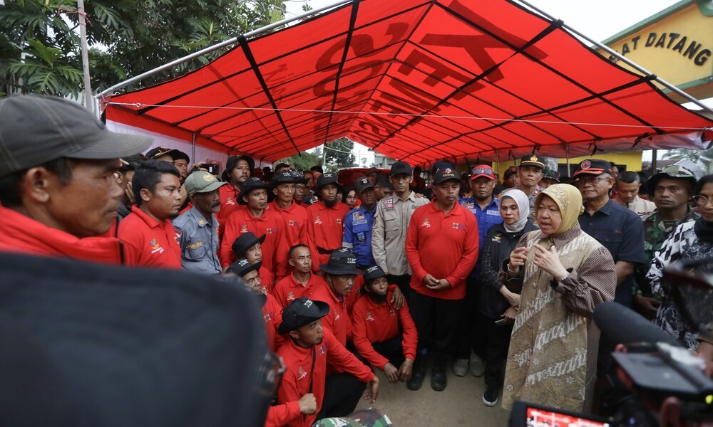 CARAPANDANG - Menteri Sosial Tri Rismaharini kunjungi warga Desa Talagajaya, Kecamatan Banjarwangi, Kabupaten Garut yang terdampak bencana tanah longsor pada Selasa (30/4). Saat meninjau secara langsung kondisi posko pengungsian di Kantor Desa Talagajaya, Mensos mengapresiasi cepatnya respons dari Kampung Siaga Bencana (KSB) sehingga bisa memberikan bantuan yang dibutuhkan dengan segera, termasuk mendirikan tenda, posko pengungsian dan dapur umum beserta semua keperluannya.