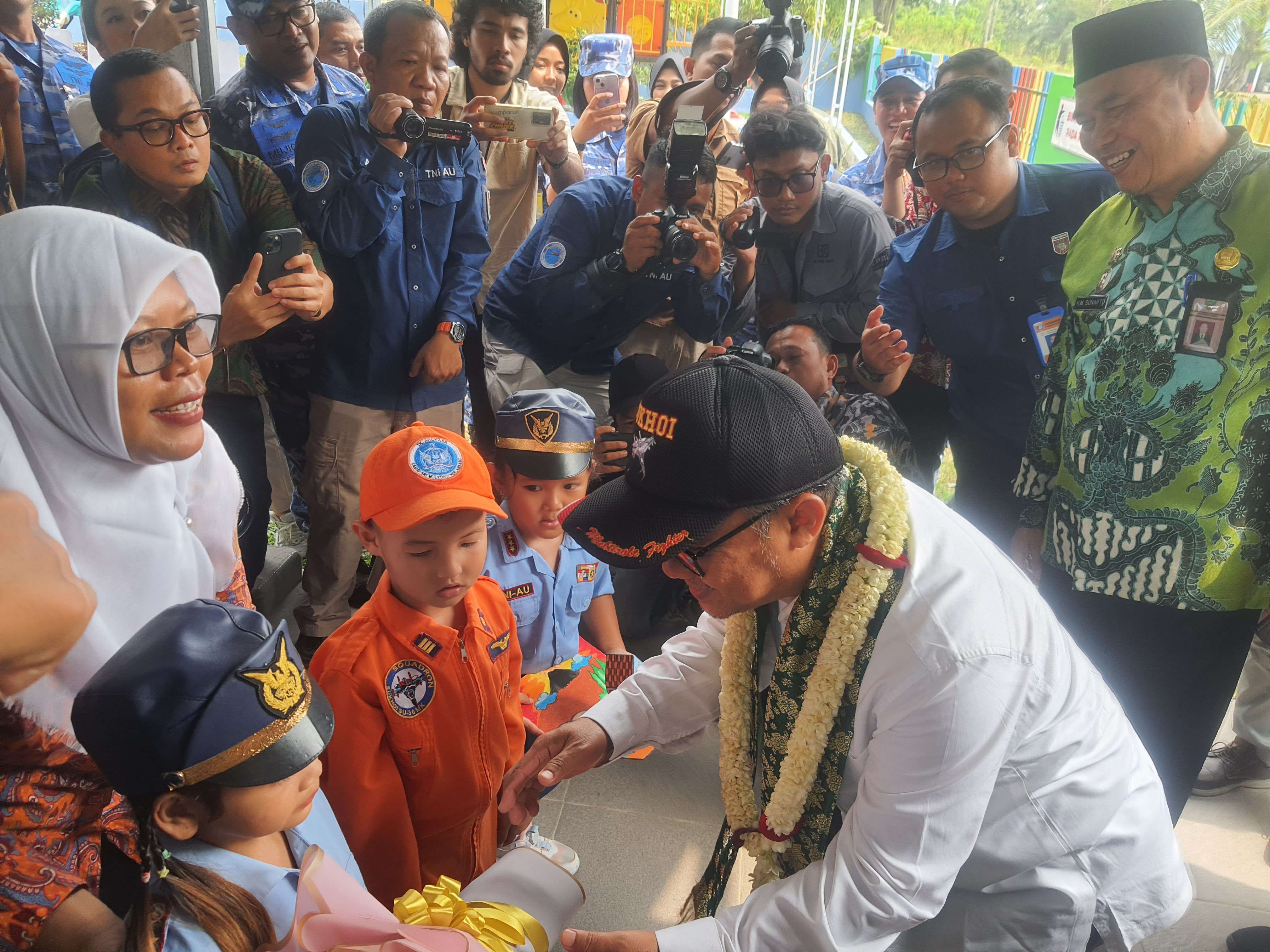 CARAPANDANG - Menteri Pendidikan Dasar dan Menengah (Mendikdasmen) Abdul Mu'ti melaksanakan kunjungan perdananya ke Palembang. Salah satu yang disasar adalah Sekolah Taman Kanak-Kanak (TK) Angkasa Sri Mulyoni Herlambang di Lanud TNI AU Sumatera Selatan.