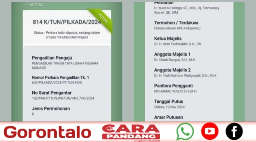 Dengan putusan ini, KPU Pohuwato dinyatakan menang dan proses hukum yang berlangsung sejak sengketa Pilkada dinyatakan selesai.