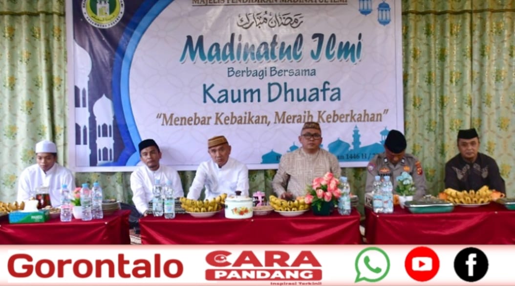 POHUWATO, CARAPANDANG - Majelis Pendidikan Madinatul Ilmi Paguat menggelar kegiatan berbagi dan buka puasa bersama kaum duafa di halaman Majelis Pendidikan Madinatul Ilmi Paguat, Jumat, (14/03/2025). Kegiatan penuh kebersamaan ini turut dihadiri oleh Bupati Pohuwato, Saipul A. Mbuinga dan didampingi Camat Paguat, Ikbal Mbuinga, Camat Dengilo, Nakir Ismail, Ketua Majelis Pendidikan Madinatul Ilmi, Abdul Muthalib Karim, dan Pengasuh Pondok Madinatul Ilmi Paguat, Ust. Wahyu Arsyad, selaku pembawa ceramah agama menjelang buka puasa.
