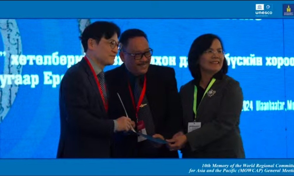 Ucapan selamat dan sertifikat diserahkan oleh Kwibae Kim pemimpin Memory of the World Regional Committee for Asia and the Pacific (MOWCAP) kepada Kepala Arsip Nasional Indonesia (ANRI) Imam Gunarto didampingi oleh Deputi Bidang Pengembangan Bahan Pustaka dan Jasa Informasi Perpustakaan Nasional Republik Indonesia (Perpusnas) Mariana Ginting Rabu (8/5/2024).