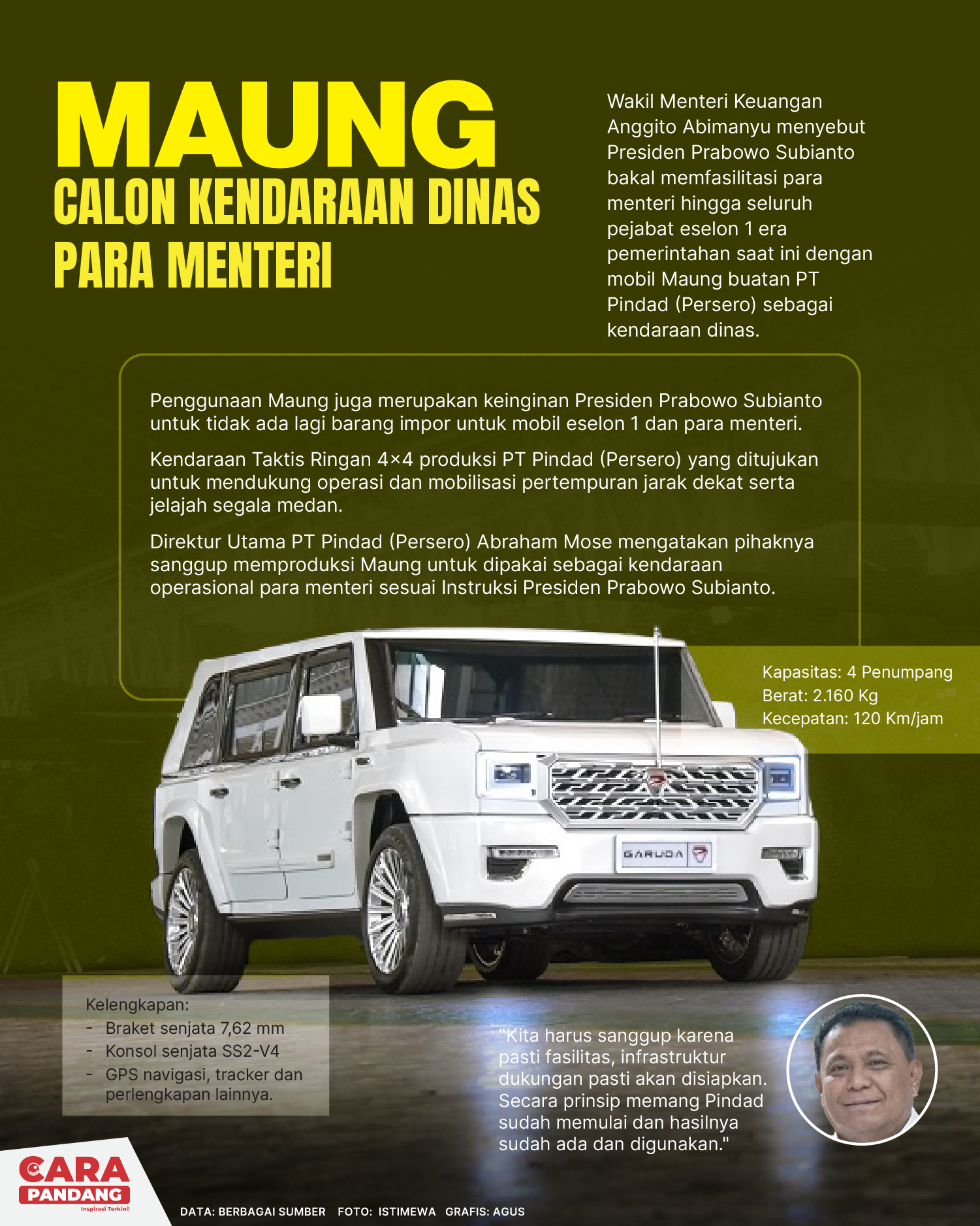 CARAPANDANG.COM - Wakil Menteri Keuangan Anggito Abimanyu menyebut Presiden Prabowo Subianto bakal memfasilitasi para menteri hingga seluruh pejabat eselon 1 era pemerintahan saat ini dengan mobil Maung buatan PT Pindad (Persero) sebagai kendaraan dinas.