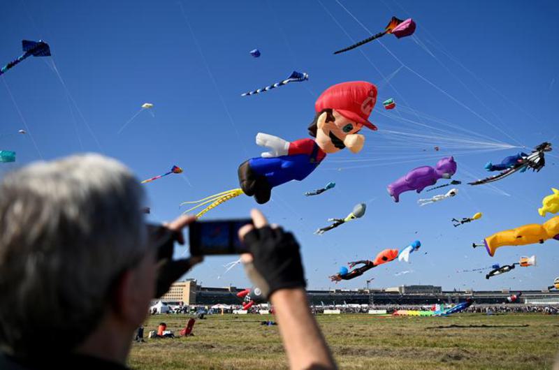 Seorang pria memotret layang-layang dalam Festival Layang-Layang Raksasa ke-12 di Berlin, Jerman, pada 27 September 2025. (Xinhua/Zhang Haofu)