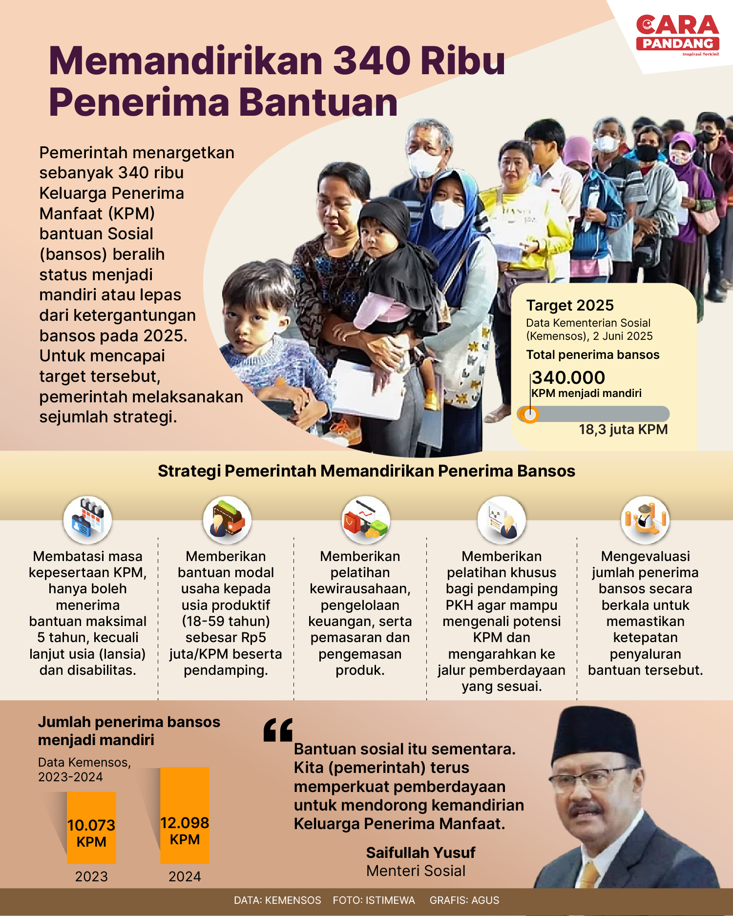 CARAPANDANG - Pemerintah memiliki target ambisius untuk mendorong sebanyak 340 ribu Keluarga Penerima Manfaat (KPM) bantuan sosial (bansos) agar dapat mandiri dan tidak lagi bergantung pada bantuan tersebut pada tahun 2025. Untuk mencapai tujuan yang dijanjikan, pemerintah sedang melakukan berbagai strategi yang diharapkan dapat membantu KPM tersebut meraih kemandirian.