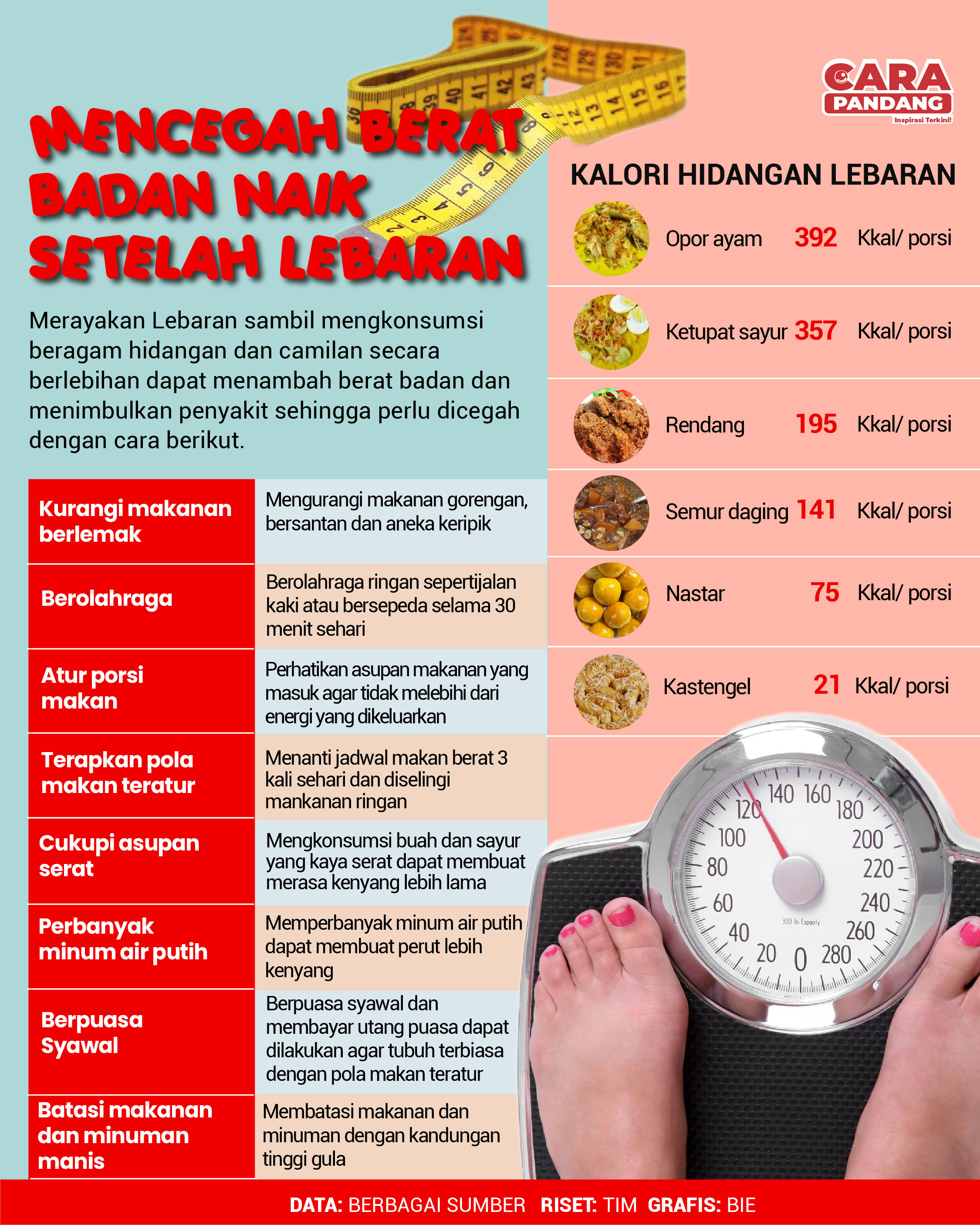 CARAPANDANG - Merayakan Lebaran sambil mengkonsumsi beragam hidangan dan camilan secara berlebihan dapat menambah berat badan dan menimbulkan penyakit sehingga perlu dicegah dengan cara berikut.
