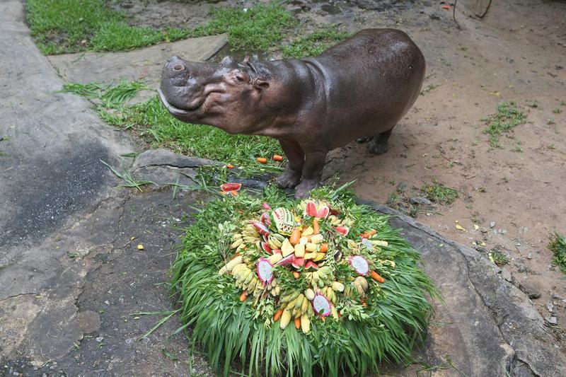 Mae Mali, seekor kuda nil betina, merayakan ulang tahunnya yang ke-60 di Kebun Binatang Terbuka Khao Kheow (Khao Kheow Open Zoo) di Provinsi Chonburi, Thailand, pada 8 September 2025. (Carapandang/Xinhua/Rachen Sageamsak)
