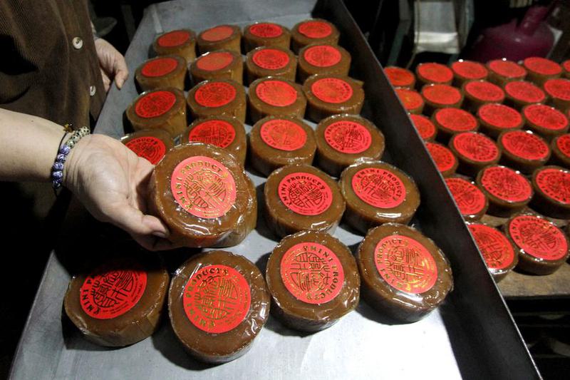 Seorang pekerja menunjukkan produk jadi kue keranjang atau nian gao tradisional yang sudah dikemas di sebuah pabrik rumahan bernama Mini Bakery di Solo, Provinsi Jawa Tengah, pada 17 Januari 2025. (Xinhua/Bram Selo)