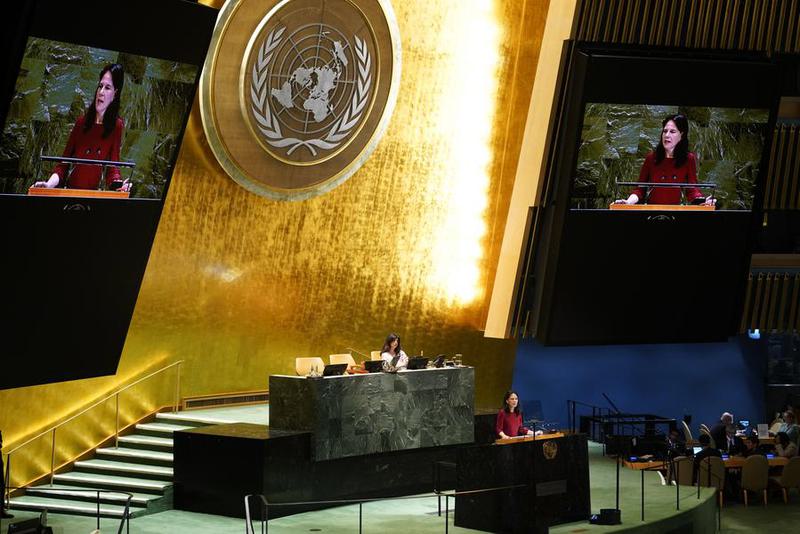 Annalena Baerbock, presiden sesi ke-80 Majelis Umum Perserikatan Bangsa-Bangsa (United Nations General Assembly/UNGA), menyampaikan pidato penutup dalam Debat Umum sesi ke-80 UNGA di markas besar PBB di New York pada 29 September 2025. (Xinhua/Wu Xiaoling)