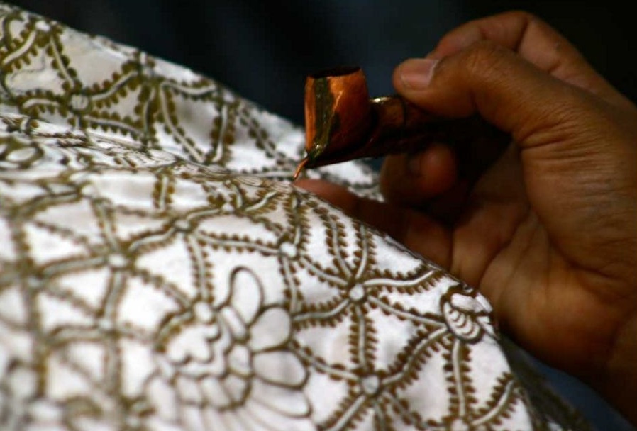 Tangannya dengan luwes menggerakkan canting, mengoleskan lilin panas mengikuti sketsa motif Wahyu Tumurun di atas selembar kain.sehelai kain putih.