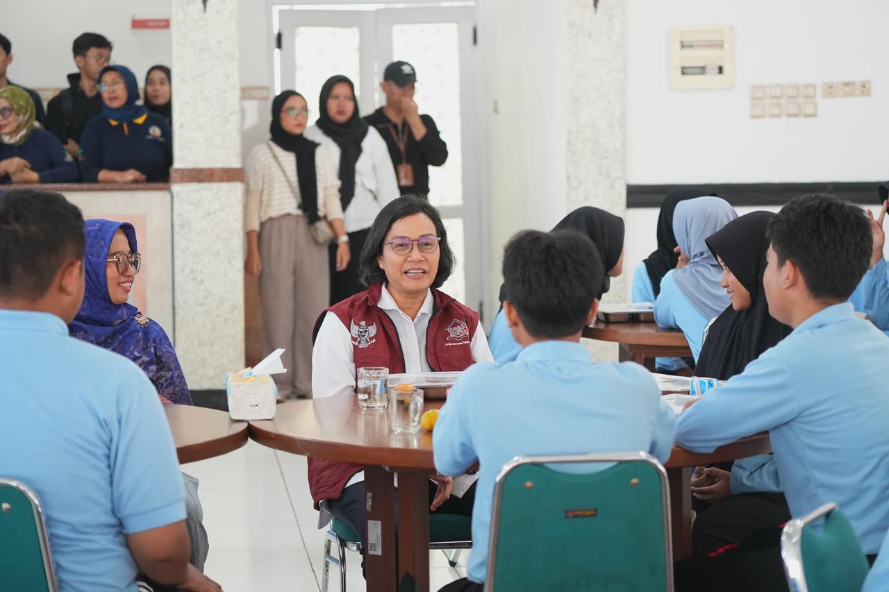 CARAPANDANG - Menteri Keuangan Sri Mulyani Indrawati bersama Menteri Sosial Saifullah Yusuf (Gus Ipul) makan siang bareng para siswa Sekolah Rakyat Menengah Atas (SRMA) 10 Jakarta Selatan, Sabtu (9/8/2025).