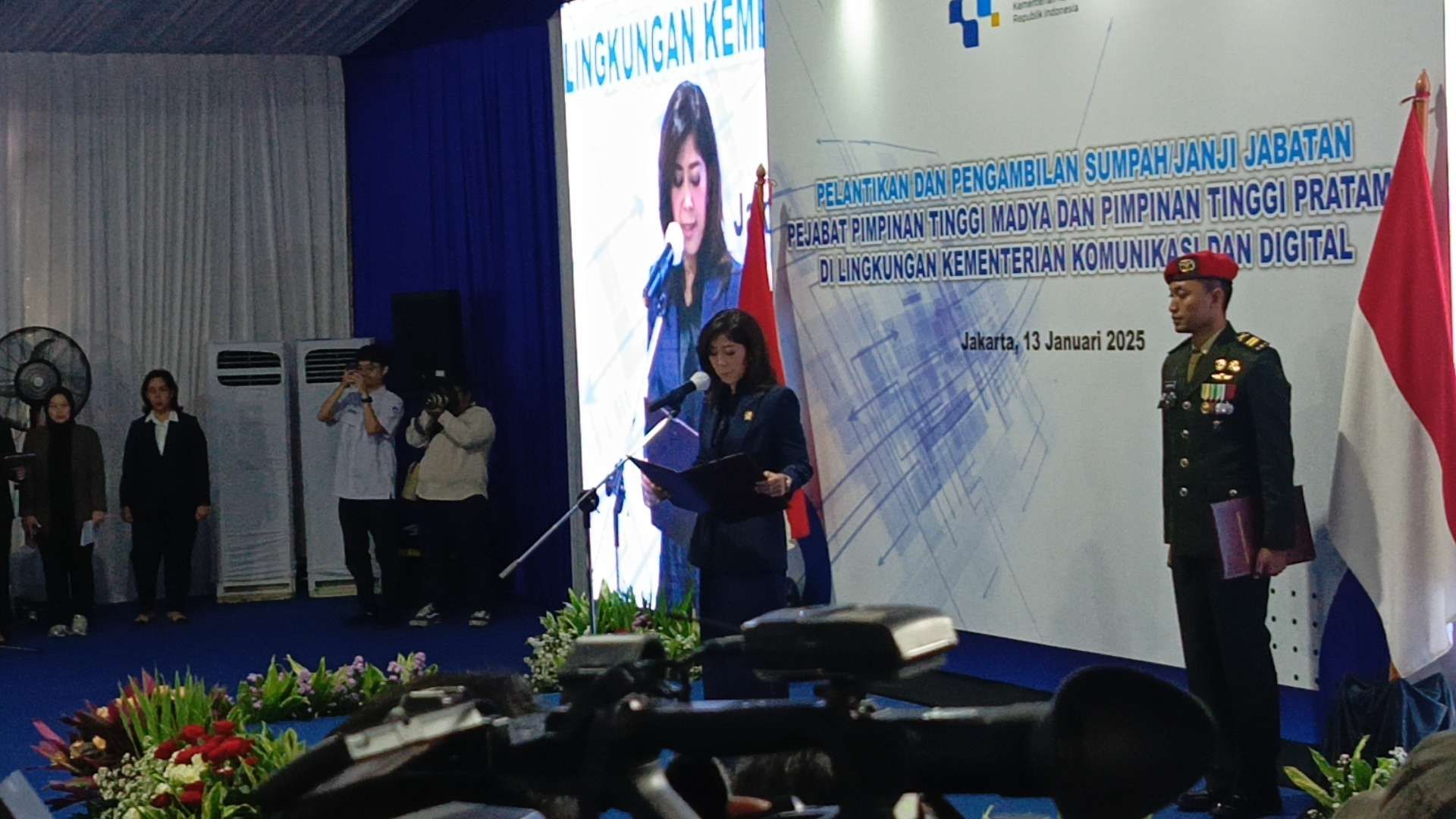 "Saya Menkomdigi dengan ini secara resmi melantik saudara/saudari dalam jabatan yang baru di lingkungan Komdigi. Saya percaya bahwa saudara saudari akan melaksanakn tugas dengan sebaik baiknya sesuai dengan tanggungjawab yang diberikan," kata Meutya dalam pengangkatan sumpah jabatan di Kemkomdi, Jakarta, Senin (13/1/2205).