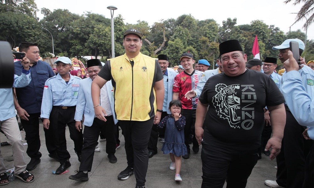 CARAPANDANG - Menteri Pemuda dan Olahraga Republik Indonesia (Menpora RI) Dito Ariotedjo menghadiri Puncak Milad Ke-46 Badan Komunikasi Pemuda Remaja Masjid Indonesia (BKPRMI) di Pelataran Masjid Istiqlal, Minggu (3/8). Puncak Milad ini diisi Pawai Akbar Jalan Sehat yang diikuti ribuan santri di bawah naungan BKPRMI.
