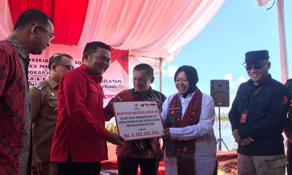Menteri Sosial Tri Rismaharini menyerahkan 51 unit kapal 5 GT (gross ton) kepada 51 nelayan di Kabupaten Bangka dan Kabupaten Bangka Tengah.