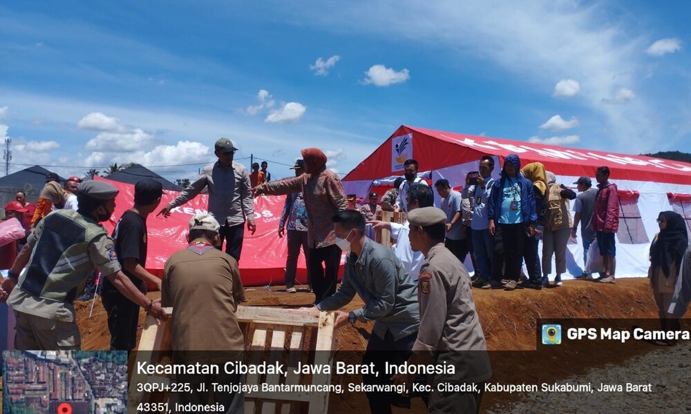 CARAPANDANG - Menteri Sosial Tri Rismaharini mengunjungi lokasi terdampak longsor di Desa Sekarwangi Kecamatan Cibadak, Sukabumi. Mensos bersama tim memasang tenda bagi masyarakat terdampak longsor di Kabupaten Sukabumi. Selain tenda, bantuan logistik Kementerian Sosial sudah lebih dahulu disalurkan pada Rabu (24/1).