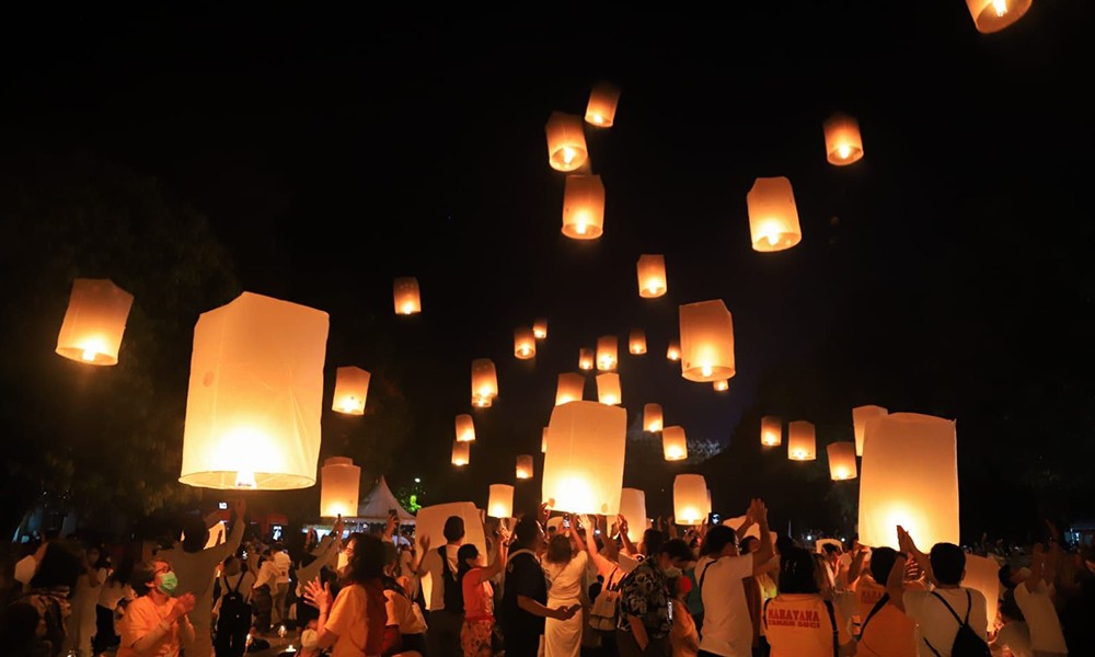 CARAPANDANG - Sekitar 2567 buah lampion diterbangkan di area Marga Utama Taman Wisata Candi Borobudur, Kabupaten Magelang, Jawa Tengah, Minggu malam menutup rangkaian Waisak 2567 BE/2023.