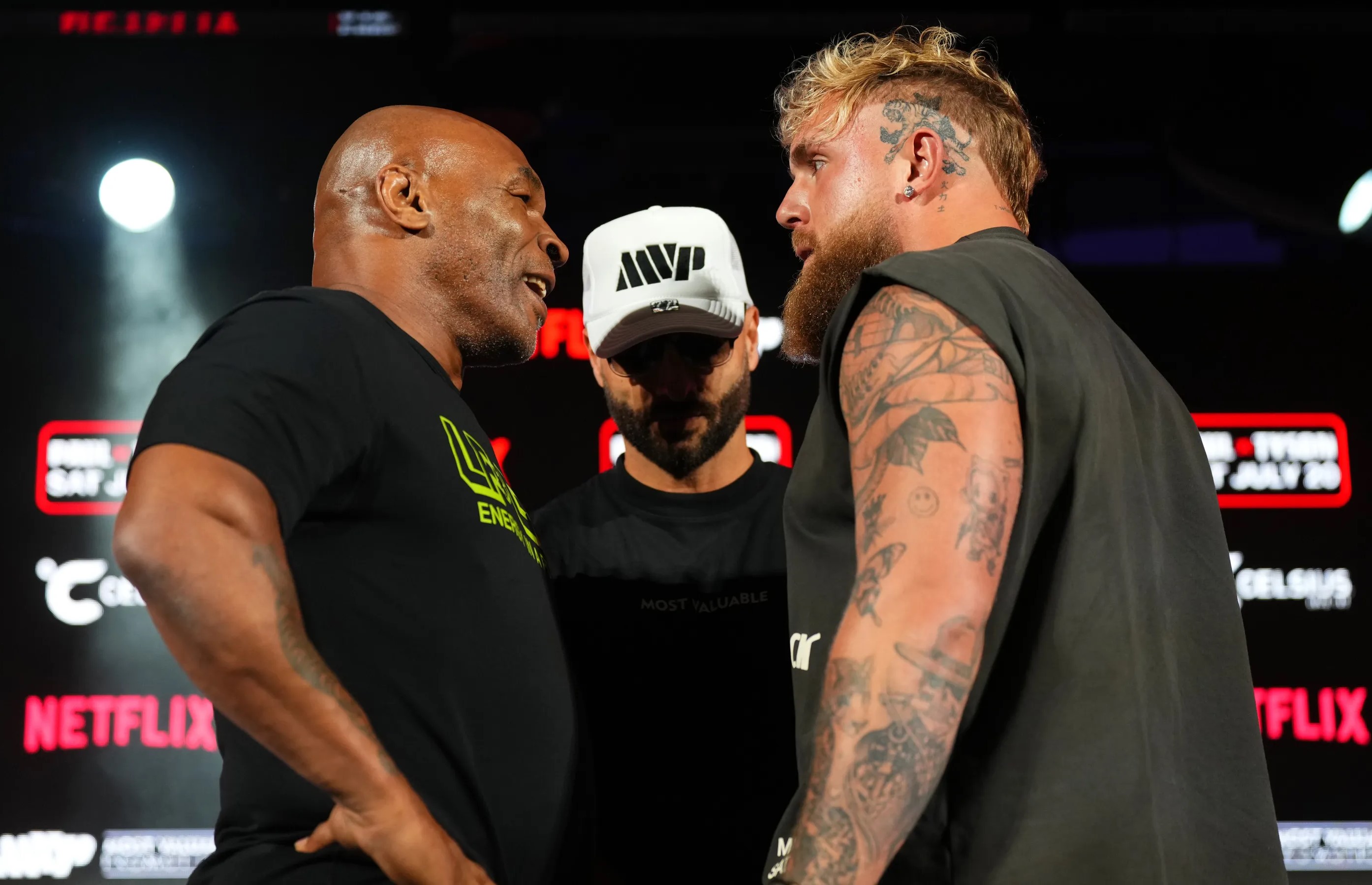 Tyson berhadapan langsung dengan Jake Paul pada sesi faceoff menjelang pertarungan mereka, tetapi Tyson tidak banyak bicara selama sesi tanya jawab.