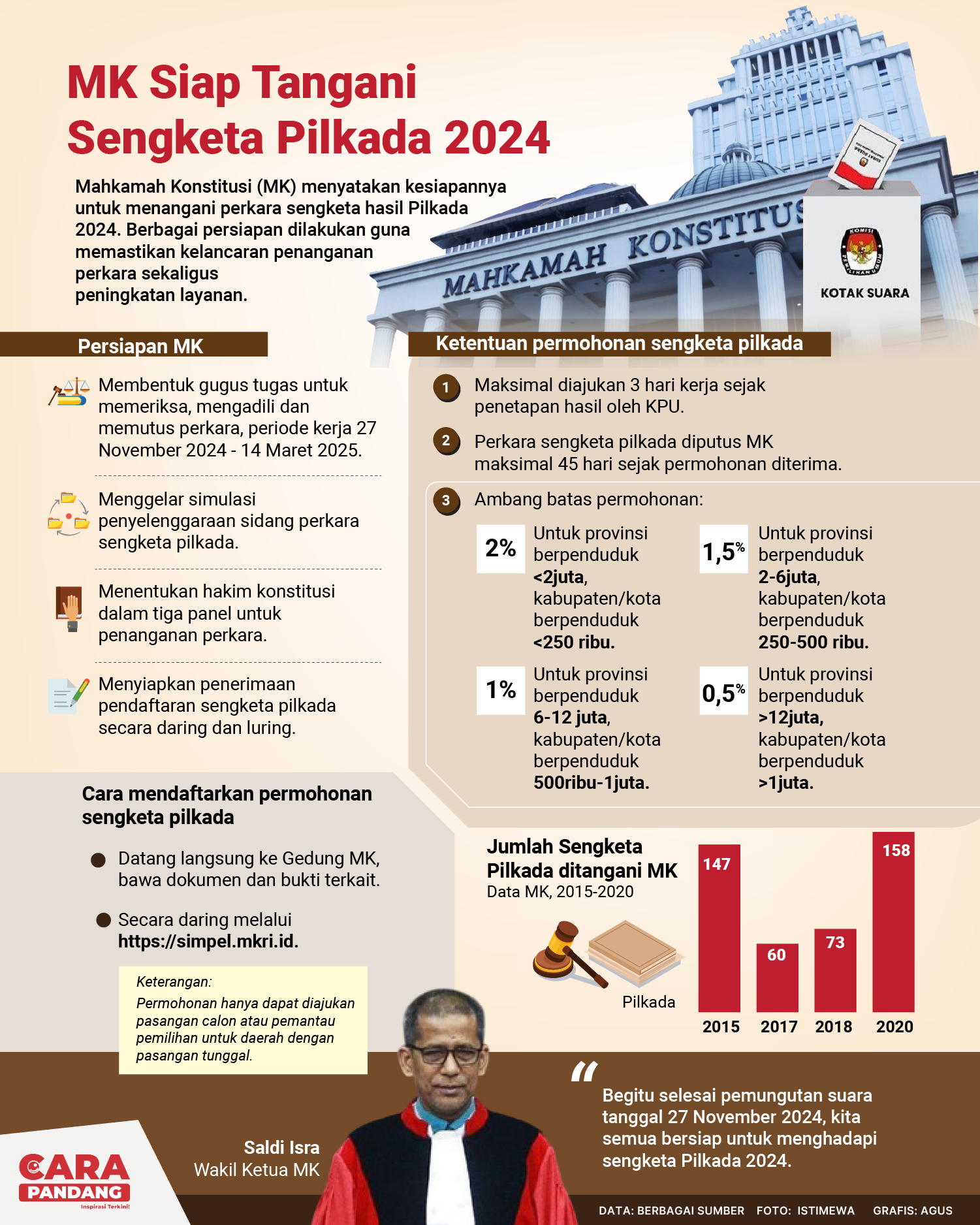 Beranda Infografis MK Siap Tangani Sengketa Pilkada 2024 Infografis MK Siap Tangani Sengketa Pilkada 2024 Infografik MK Siap Tangani Sengketa Pilkada 2024 Penulis Edo Soeryadi - 28 November 2024 21:53 0 CARAPANDANG.COM - Infografik Tags MK Pilkada 2024 Berita Sebelumnya Presiden Hadiri Puncak HGN 2024, Mendikdasmen: Komitmen Majukan Pendidikan Nasional Berita Berikutnya Indonesia Dalam Dilema Misi Perdamaian Dunia LEAVE A REPLY Cancel reply Comment: Please enter your comment! Name:* Please enter your name here Email:* You have entered an incorrect email address! Please enter your email address here Website: Save my name, email, and website in this browser for the next time I comment. Berita Teratas Kisah Ajaib Nabi Sulaiman dan Anak yang Berbakti kepada Orang Tua 8 Cara Merawat Kucing Kesayangan Agar Tubuhnya Selalu Sehat Minuman yang Mampu Redakan Batuk yang Menganggu Manfaat Ajaib Bawang Putih Bagi Kesehatan 8 Cara Menjaga Kesehatan Gigi dan Mulut yang Efektif Berita Terkait Berita Terkait Wajah Baru PP Tunas: Garda Terdepan Perlindungan Anak Indonesia Zoel Rachman - 31 Maret 2026 09:42 MBG 5 Hari Sepekan Masih Wacana Maliq - 30 Maret 2026 11:49 Presiden Ingin Semua Kendaraan Dikonversi ke Listrik Maliq - 30 Maret 2026 11:48 Kewaijiban PSE Terhadap Pengguna Anak Maliq - 30 Maret 2026 11:15