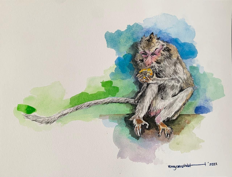 Monyet-monyet tersebut, yang bernama latin Macaca fascicularis, dilukis secara realis dengan sapuan tipis dan ringan untuk mengabadikan potret kehidupan primata itu.