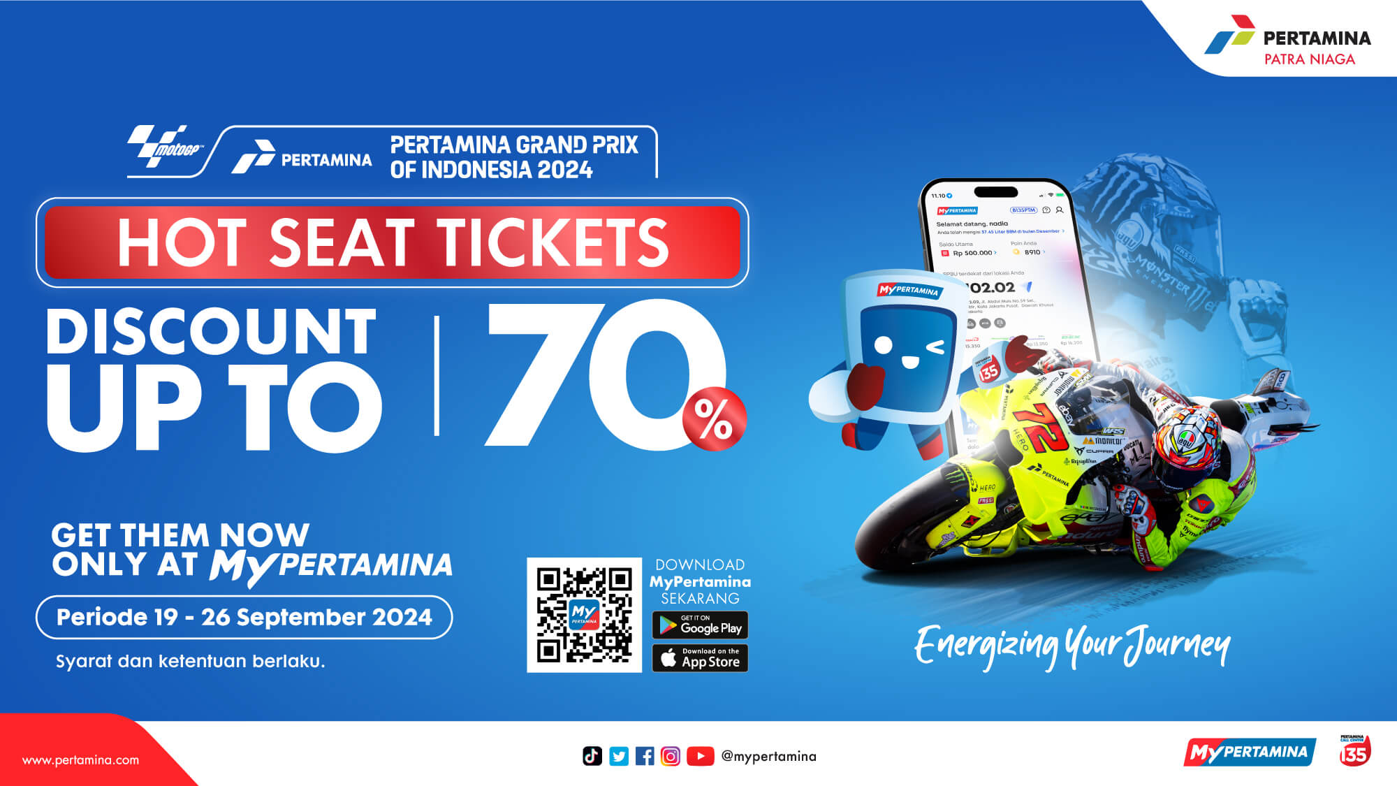 CARAPANDANG - PT Pertamina Patra Niaga memberikan program diskon tiket ajang balap motor dunia MotoGP Pertamina Grand Prix of Indonesia 2024 pada 27-29 September 2024 hingga 70 persen untuk pembelian tiket eksklusif di aplikasi MyPertamina.