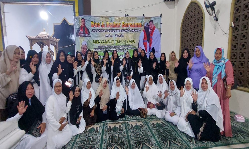 POHUWATO, CARAPANDANG.COM - NabaTour Cabang Provinsi Gorontalo menggelar acara doa dan dzikir bersama Jamaah Naba Tour dan masyarakat Pohuwato dalam rangka menyambut Tahun Baru 2024. Dengan tema "Dengan Hati Yang Bersih Dan Penuh Syukur," acara ini berlangsung di Masjid Pastabiqulkahirat Desa Buntulia Selatan, Kecamatan Buntulia, Kabupaten Pohuwato, pada Minggu Malam, (31/12/2023).