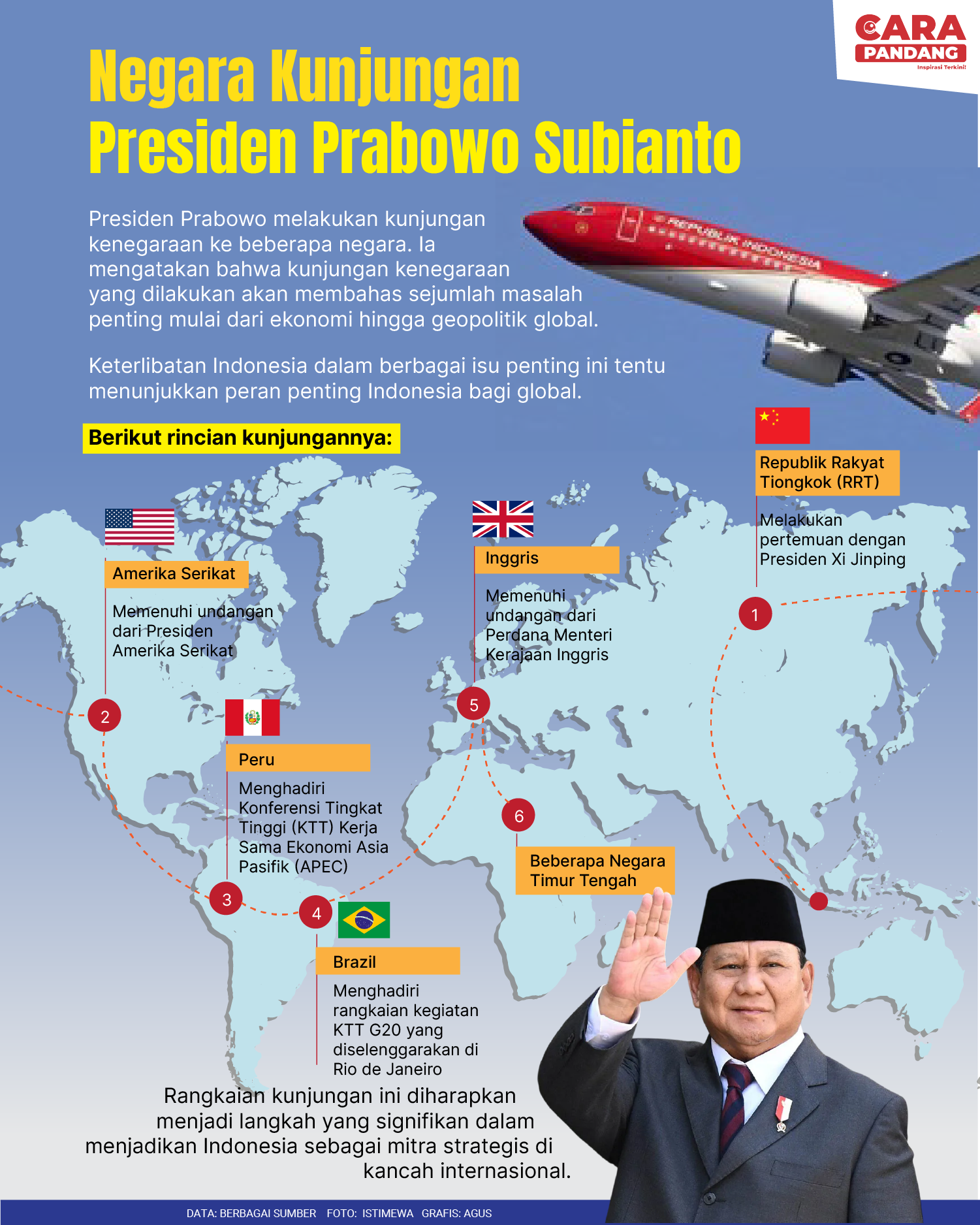 CARAPANDANG.COM - Presiden Prabowo melakukan kunjungan kenegaraan ke beberapa negara. Ia mengatakan bahwa kunjungan kenegaraan yang dilakukan akan membahas sejumlah masalah penting mulai dari ekonomi hingga geopolitik global.