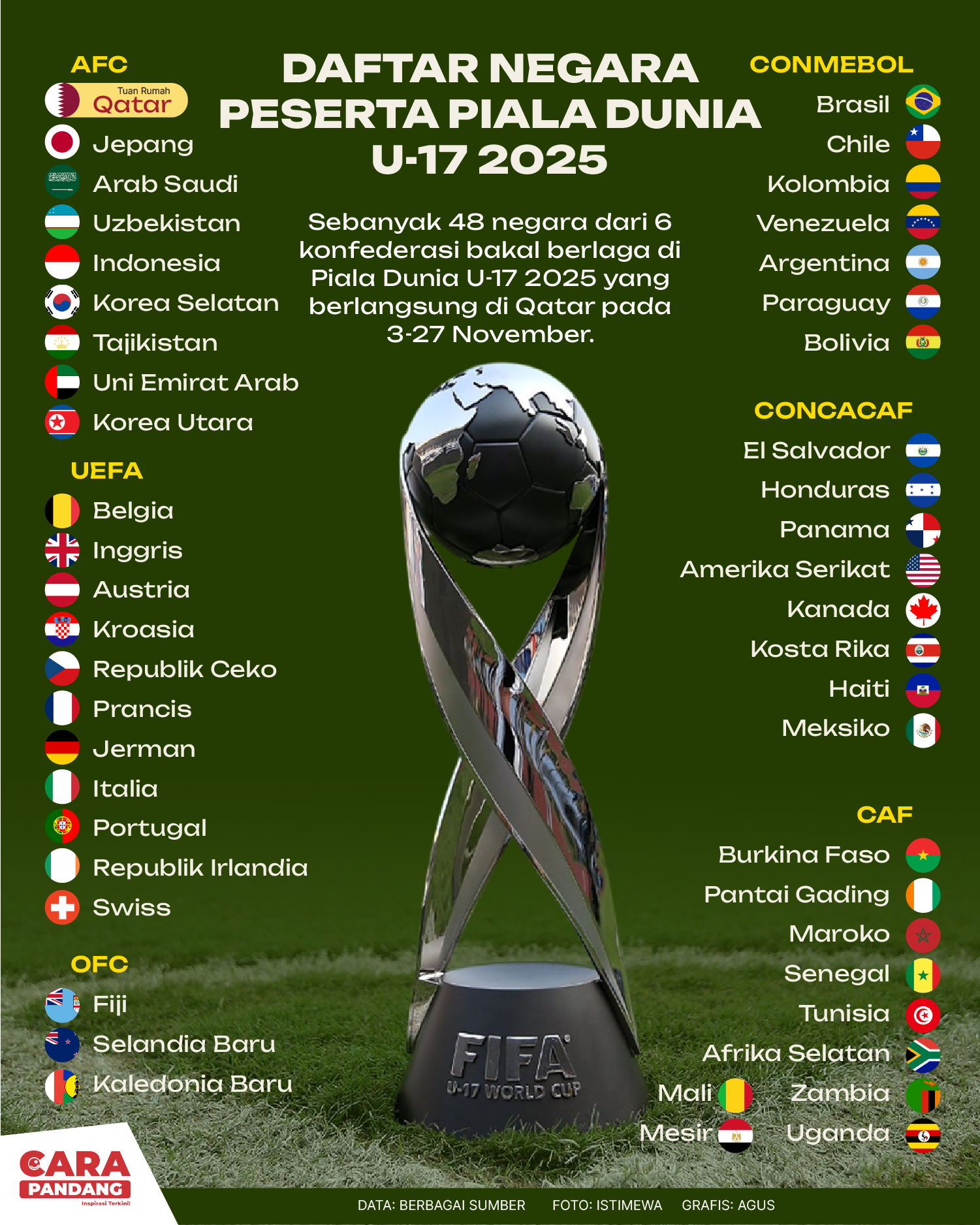 Beranda Infografis Negara Peserta Piala Dunia U-17 2025 Infografis Negara Peserta Piala Dunia U-17 2025 Penulis Amira Izzati - 24 April 2025 02:33 0 CARAPANDANG - Negara Peserta Piala Dunia U-17 2025 Tags Berita Sebelumnya Muhaimin Sebut Bukan Hanya Indonesia, Seluruh Dunia Juga Tidak Baik-baik Saja Berita Berikutnya Indonesia Dalam Dilema Misi Perdamaian Dunia LEAVE A REPLY Cancel reply Comment: Please enter your comment! Name:* Please enter your name here Email:* You have entered an incorrect email address! Please enter your email address here Website: Save my name, email, and website in this browser for the next time I comment. Berita Teratas Kisah Ajaib Nabi Sulaiman dan Anak yang Berbakti kepada Orang Tua 8 Cara Merawat Kucing Kesayangan Agar Tubuhnya Selalu Sehat Minuman yang Mampu Redakan Batuk yang Menganggu Manfaat Ajaib Bawang Putih Bagi Kesehatan 8 Cara Menjaga Kesehatan Gigi dan Mulut yang Efektif Berita Terkait Berita Terkait Wajah Baru PP Tunas: Garda Terdepan Perlindungan Anak Indonesia Zoel Rachman - 31 Maret 2026 09:42 MBG 5 Hari Sepekan Masih Wacana Maliq - 30 Maret 2026 11:49 Presiden Ingin Semua Kendaraan Dikonversi ke Listrik Maliq - 30 Maret 2026 11:48 Kewaijiban PSE Terhadap Pengguna Anak Maliq - 30 Maret 2026 11:15