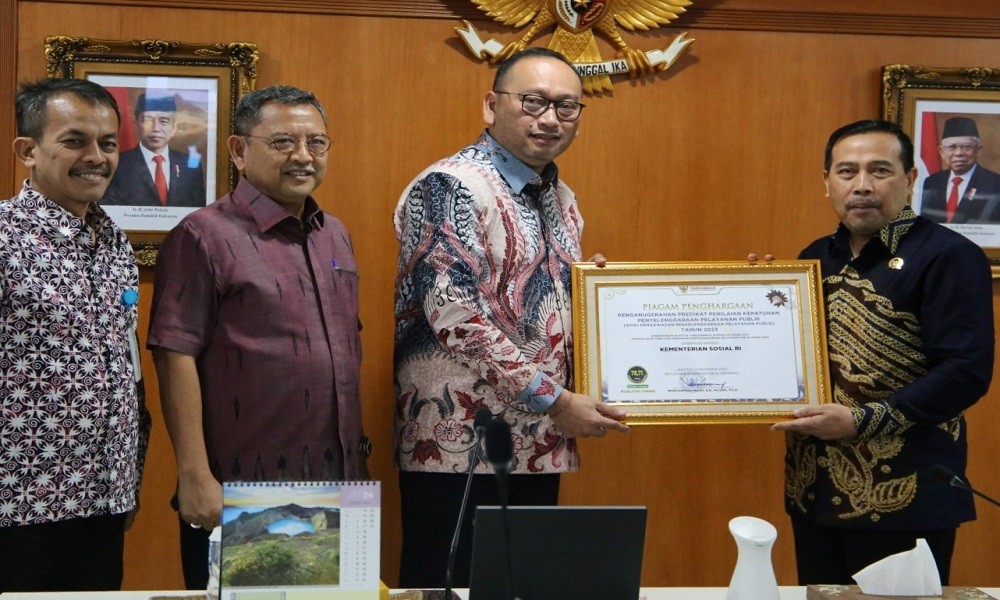 CARAPANDANG - Ketua Ombudsman RI Mokhammad Najih mengunjungi kantor Kementerian Sosial di Salemba Jakarta untuk menyerahkan penghargaan atas Predikat Penilaian Publik Kepatuhan Penyelenggaraan Pelayanan Publik tahun 2023 kepada Kementerian Sosial RI.