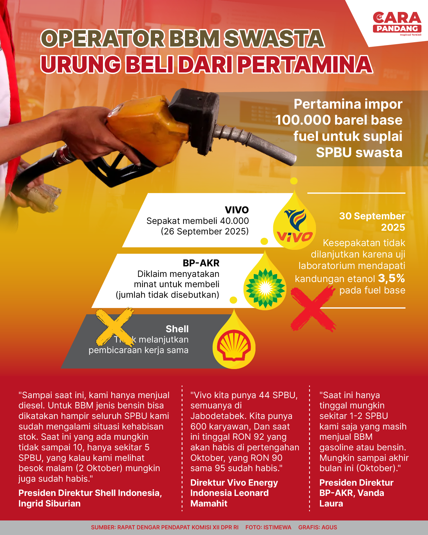 Beranda Infografis Operator BBM Swasta Urung Beli dari Pertamina Infografis Operator BBM Swasta Urung Beli dari Pertamina Penulis Amira Izzati - 05 Oktober 2025 06:31 0 Operator BBM Swasta Urung Beli dari Pertamina Tags Berita Sebelumnya Menkomdigi: PWI Harus Jadi Rumah Nyaman Bagi Wartawan dan Pers Berita Berikutnya Indonesia Dalam Dilema Misi Perdamaian Dunia LEAVE A REPLY Cancel reply Comment: Please enter your comment! Name:* Please enter your name here Email:* You have entered an incorrect email address! Please enter your email address here Website: Save my name, email, and website in this browser for the next time I comment. Berita Teratas Kisah Ajaib Nabi Sulaiman dan Anak yang Berbakti kepada Orang Tua 8 Cara Merawat Kucing Kesayangan Agar Tubuhnya Selalu Sehat Minuman yang Mampu Redakan Batuk yang Menganggu Manfaat Ajaib Bawang Putih Bagi Kesehatan 8 Cara Menjaga Kesehatan Gigi dan Mulut yang Efektif Berita Terkait Berita Terkait Wajah Baru PP Tunas: Garda Terdepan Perlindungan Anak Indonesia Zoel Rachman - 31 Maret 2026 09:42 MBG 5 Hari Sepekan Masih Wacana Maliq - 30 Maret 2026 11:49 Presiden Ingin Semua Kendaraan Dikonversi ke Listrik Maliq - 30 Maret 2026 11:48 Kewaijiban PSE Terhadap Pengguna Anak Maliq - 30 Maret 2026 11:15