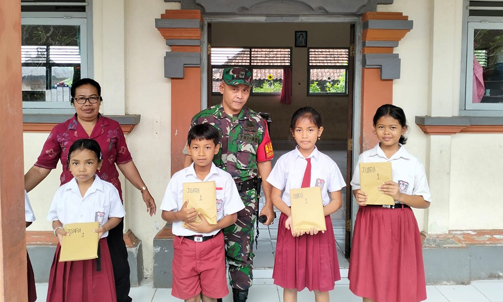 CARAPANDANG - Demi memacu semangat belajar pelajar di bangku sekolah dasar yang ada di Desa Bakas, Kecamatan Banjarangkan, seorang Babinsa Sertu I Wayan Rata rela mengeluarkan uang pribadi.