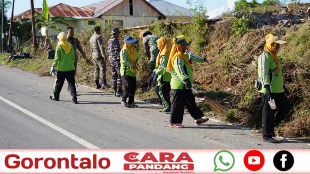 POHUWATO, CARAPANDANG - Kodim 1313/Pohuwato berkolaborasi dengan Pani Gold Project dan beberapa instansi lain serta warga masyarakat melaksanakan Karya Bakti TNI AD membersihkan beberapa titik di ruas Jalan Trans Sulawesi di Kecamatan Marisa, Kabupaten Pohuwato, Provinsi Gorontalo, Kamis, 21 November 2024.