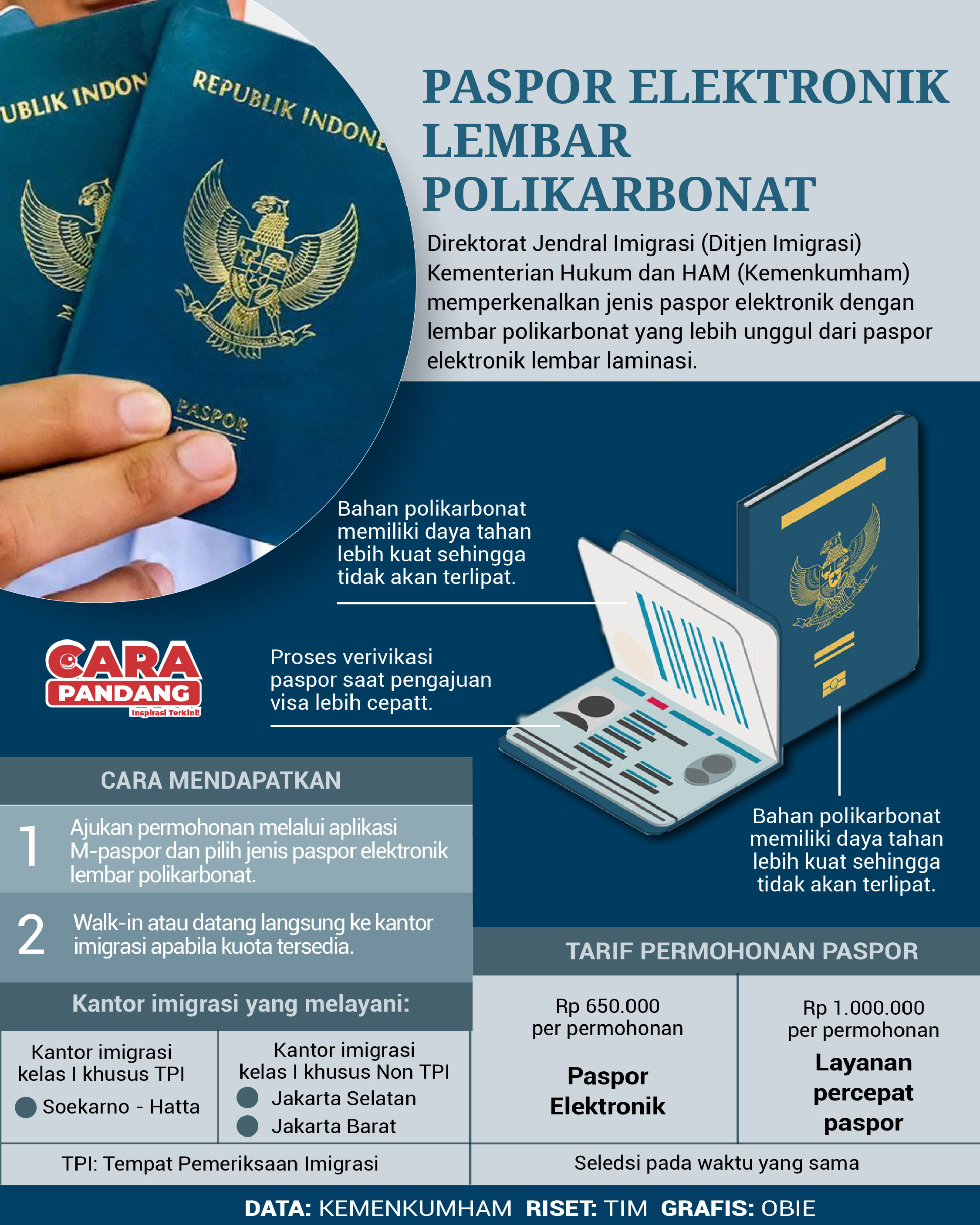 CARAPANDANG - Direktorat Jendral Imigrasi (Ditjen Imigrasi) Kementerian Hukum dan HAM (Kemenkumham) memperkenalkan jenis paspor elektronik dengan lembar polikarbonat yang lebih unggul dari paspor elektronik lembar laminasi.