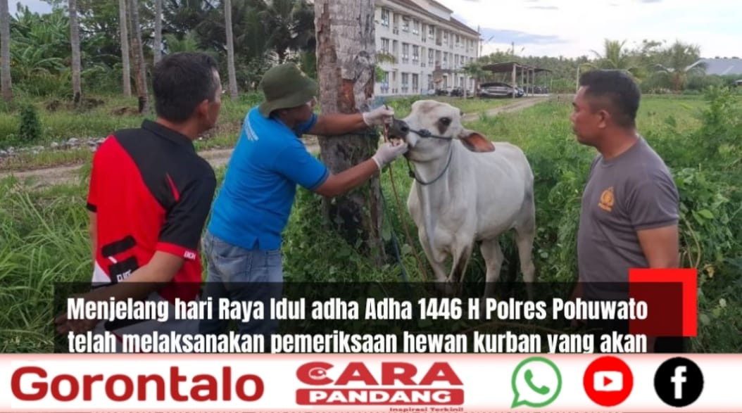 POHUWATO, CARAPANDANG - Menjelang Hari Raya Idul Adha 1446 H Polres Pohuwato telah melaksanakan pemeriksaan hewan kurban yang akan disembelih untuk memastikan kelayakan dan kehalalan hewan tersebut, serta mencegah penyebaran penyakit seperti Penyakit Mulut dan Kuku (PMK) kamis (5/6/2025)