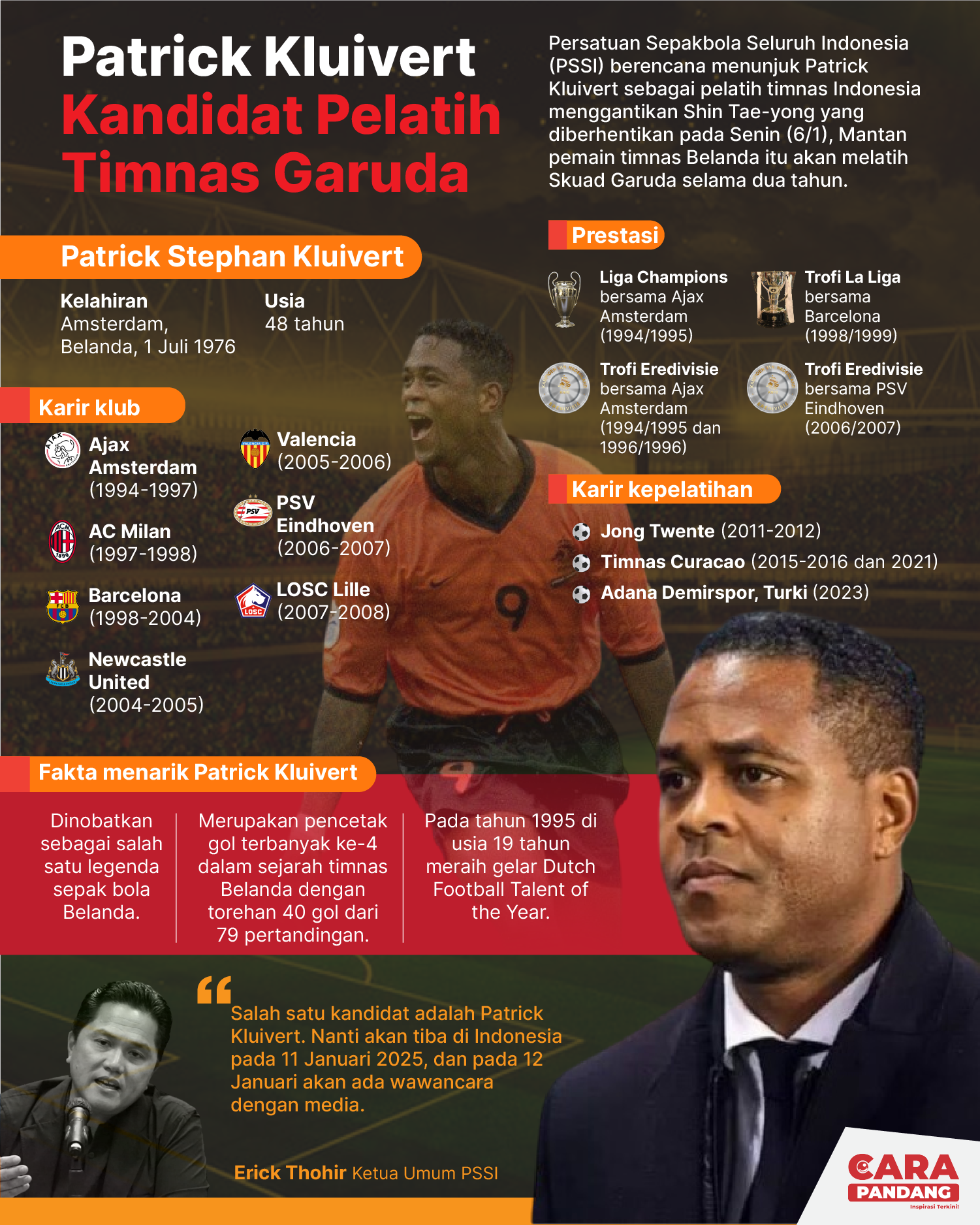 CARAPANDANG.COM - Patrick Kluivert Kandidat Pelatih Timnas Indonesia.