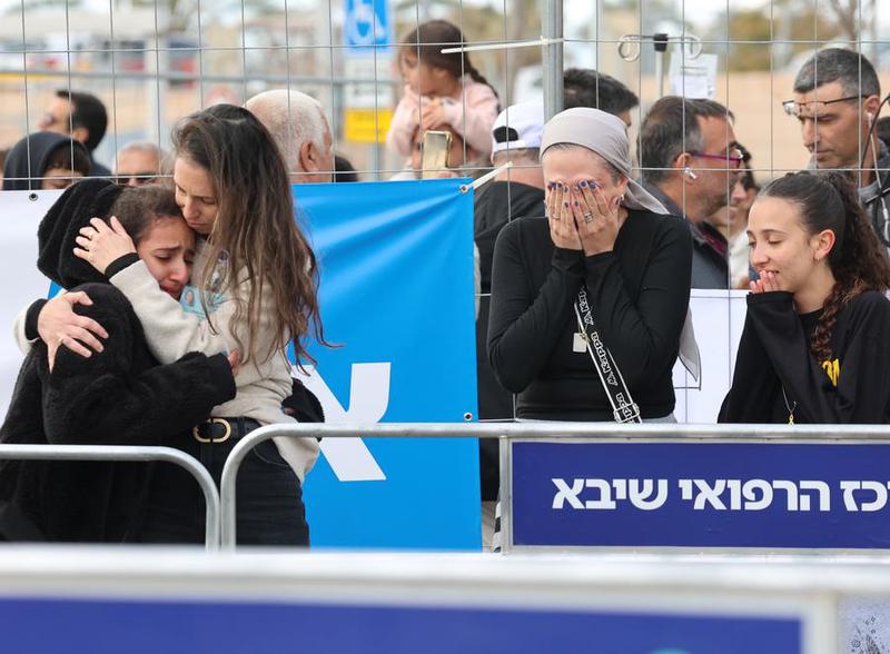 Keluarga sandera yang dibebaskan berpelukan saat helikopter yang membawa sandera tiba di pusat medis di Ramat Gan, Israel, pada 8 Februari 2025. Israel dan Hamas pada 8 Februari menyelesaikan pertukaran tahanan-sandera yang kelima di bawah fase pertama perjanjian gencatan senjata Gaza yang sedang berlangsung, menurut sejumlah narasumber Israel dan Palestina. (Xinhua/Gil Cohen Magen)