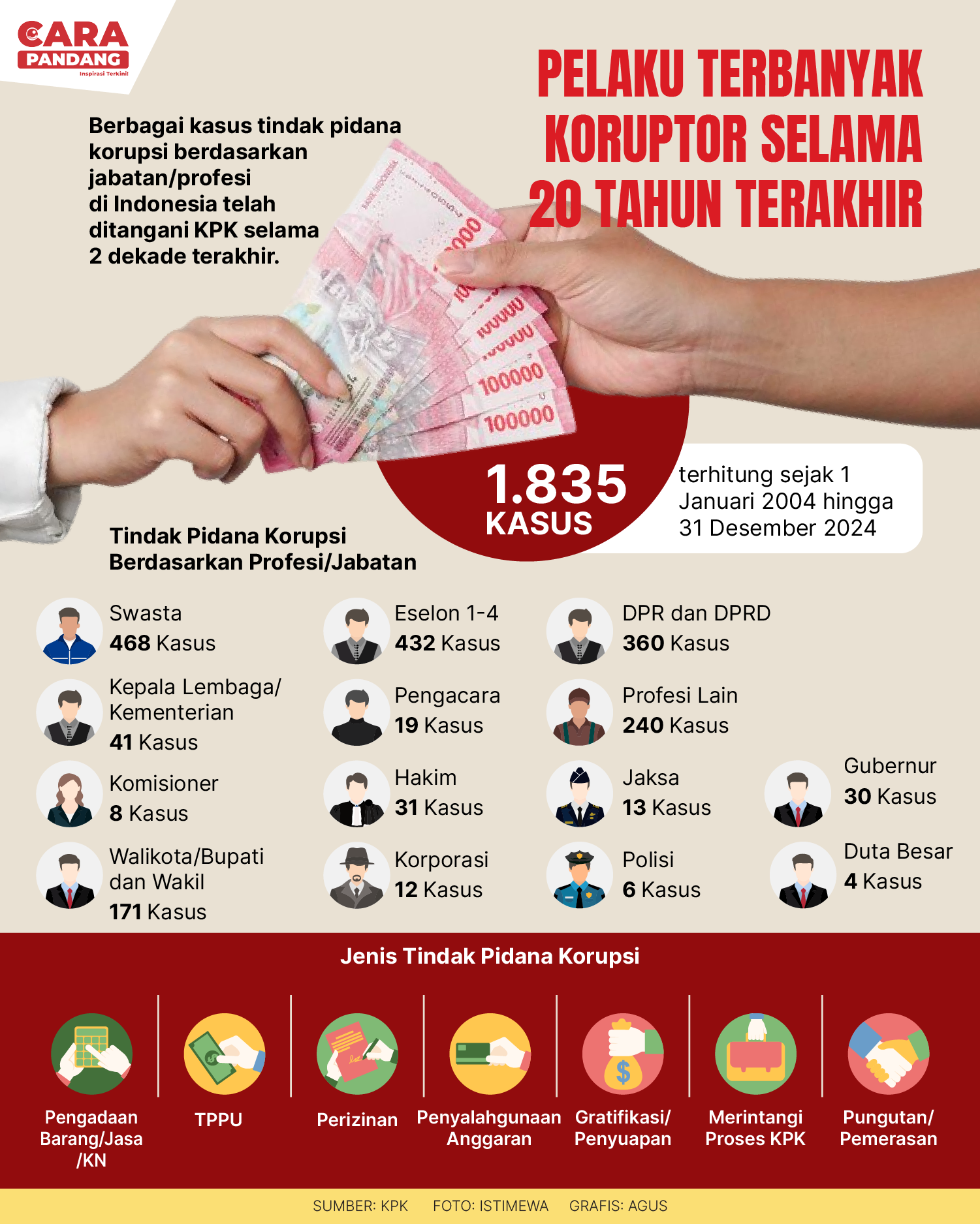 Tiga urutan besar tindak pidana korupsi itu berasal dari jabatan Swasta, Eseleon, dan Anggota DPR. Adapun tindak pidana korupsi paling banyak dilakukan oleh pegawai swasta dengan 486 kasus.