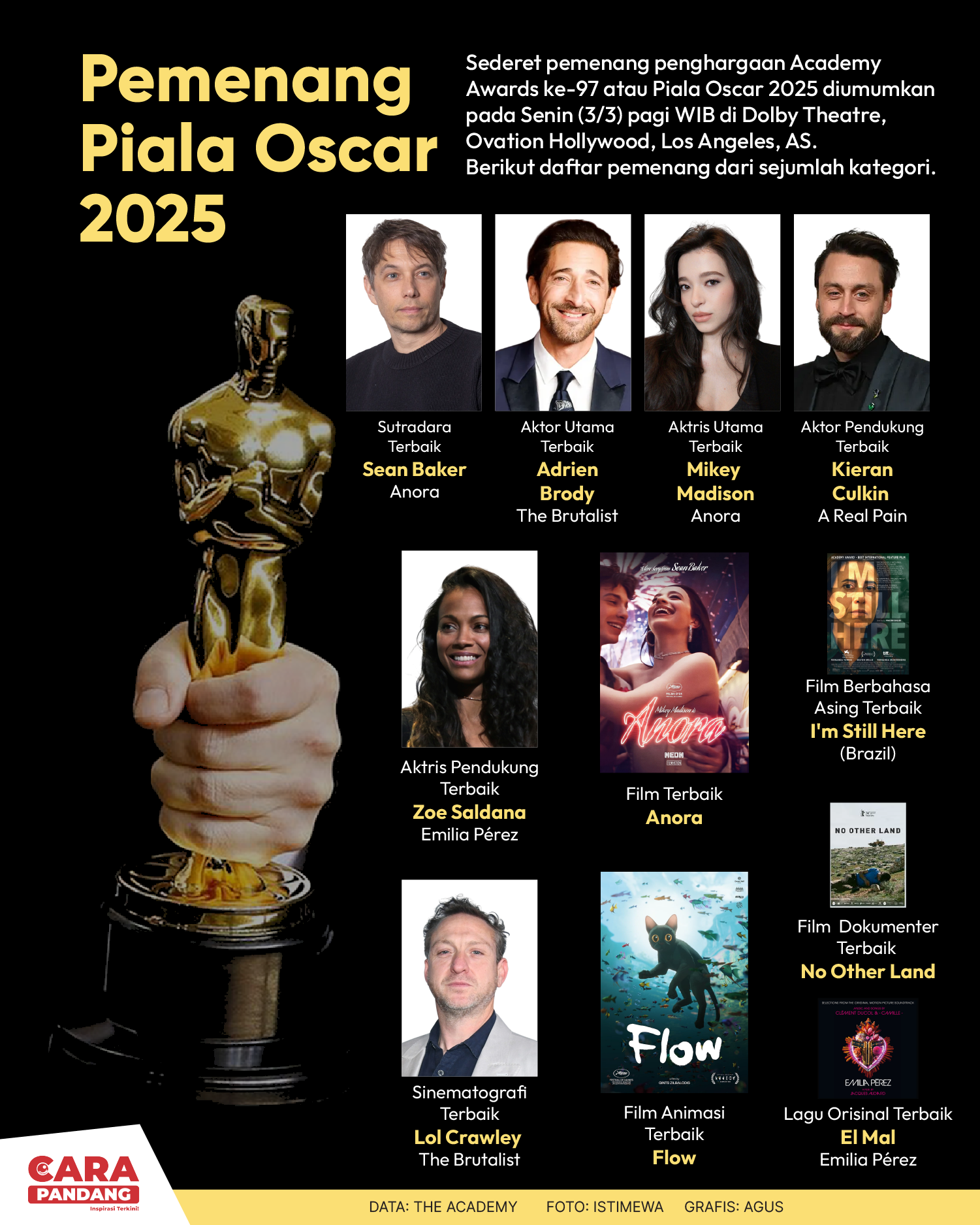 Beranda Infografis Pemenang Piala Oscar 2025 Infografis Pemenang Piala Oscar 2025 Penulis Amira Izzati - 04 Maret 2025 09:14 0 CARAPANDANG - Pemenang Piala Oscar 2025 Tags Berita Sebelumnya DPR Desak Pemerintah Segera Selamatkan Industri Padat Karya Berita Berikutnya Indonesia Dalam Dilema Misi Perdamaian Dunia LEAVE A REPLY Cancel reply Comment: Please enter your comment! Name:* Please enter your name here Email:* You have entered an incorrect email address! Please enter your email address here Website: Save my name, email, and website in this browser for the next time I comment. Berita Teratas Kisah Ajaib Nabi Sulaiman dan Anak yang Berbakti kepada Orang Tua 8 Cara Merawat Kucing Kesayangan Agar Tubuhnya Selalu Sehat Minuman yang Mampu Redakan Batuk yang Menganggu Manfaat Ajaib Bawang Putih Bagi Kesehatan 8 Cara Menjaga Kesehatan Gigi dan Mulut yang Efektif Berita Terkait Berita Terkait Wajah Baru PP Tunas: Garda Terdepan Perlindungan Anak Indonesia Zoel Rachman - 31 Maret 2026 09:42 MBG 5 Hari Sepekan Masih Wacana Maliq - 30 Maret 2026 11:49 Presiden Ingin Semua Kendaraan Dikonversi ke Listrik Maliq - 30 Maret 2026 11:48 Kewaijiban PSE Terhadap Pengguna Anak Maliq - 30 Maret 2026 11:15